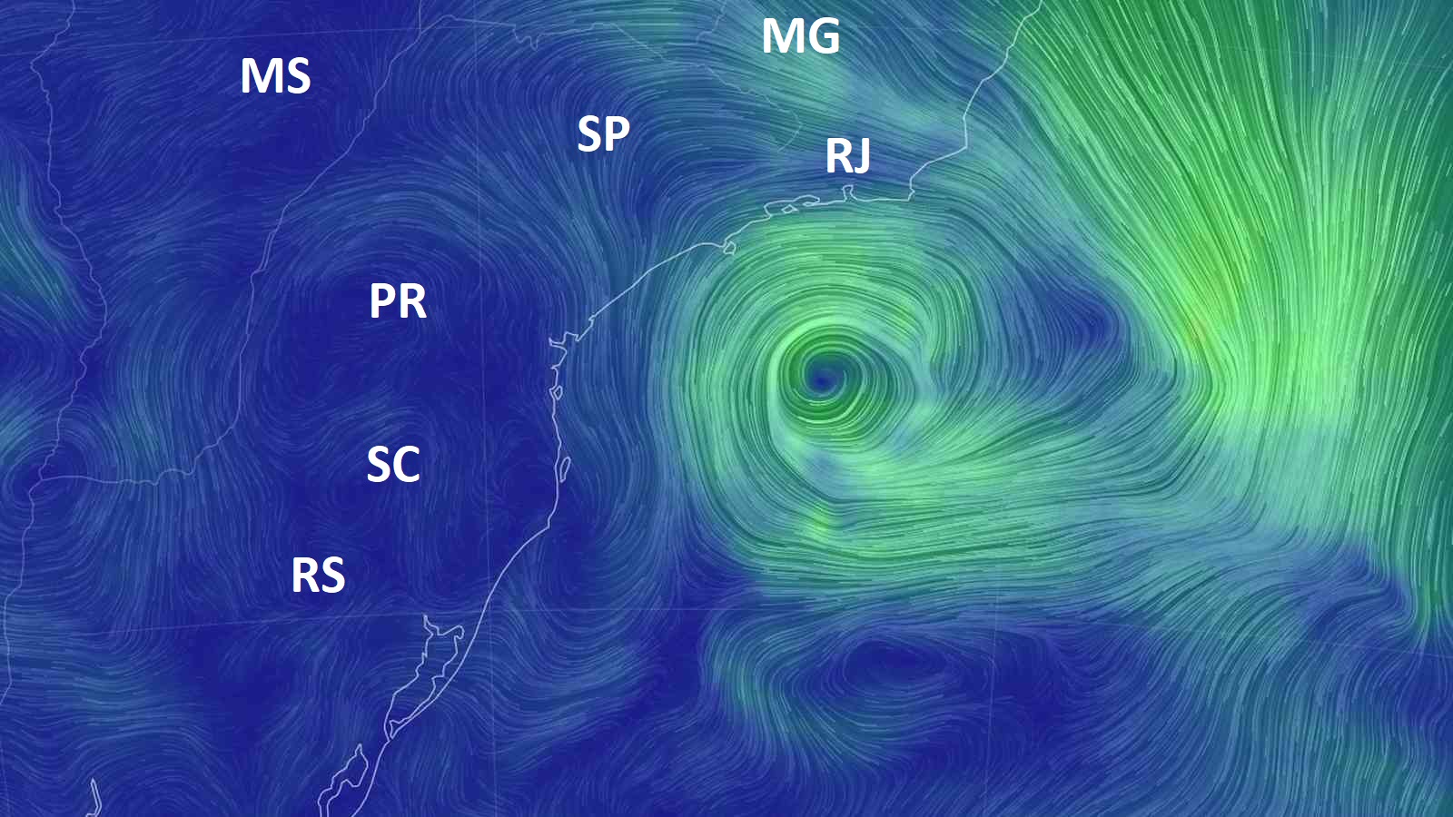 Ciclone vai estar formado sobre o mar junto aos litorais de São Paulo e do Rio de Janeiro entre esta terça e a quarta | EARTH NULL/METSUL