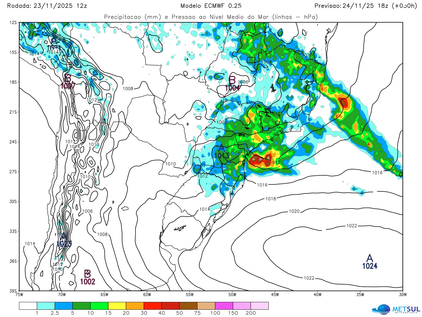 Modelos europeu indica instabilidade mais forte pela baixa pressão nesta segunda entre Santa Catarina, Paraná, São Paulo e Minas Gerais | METSUL