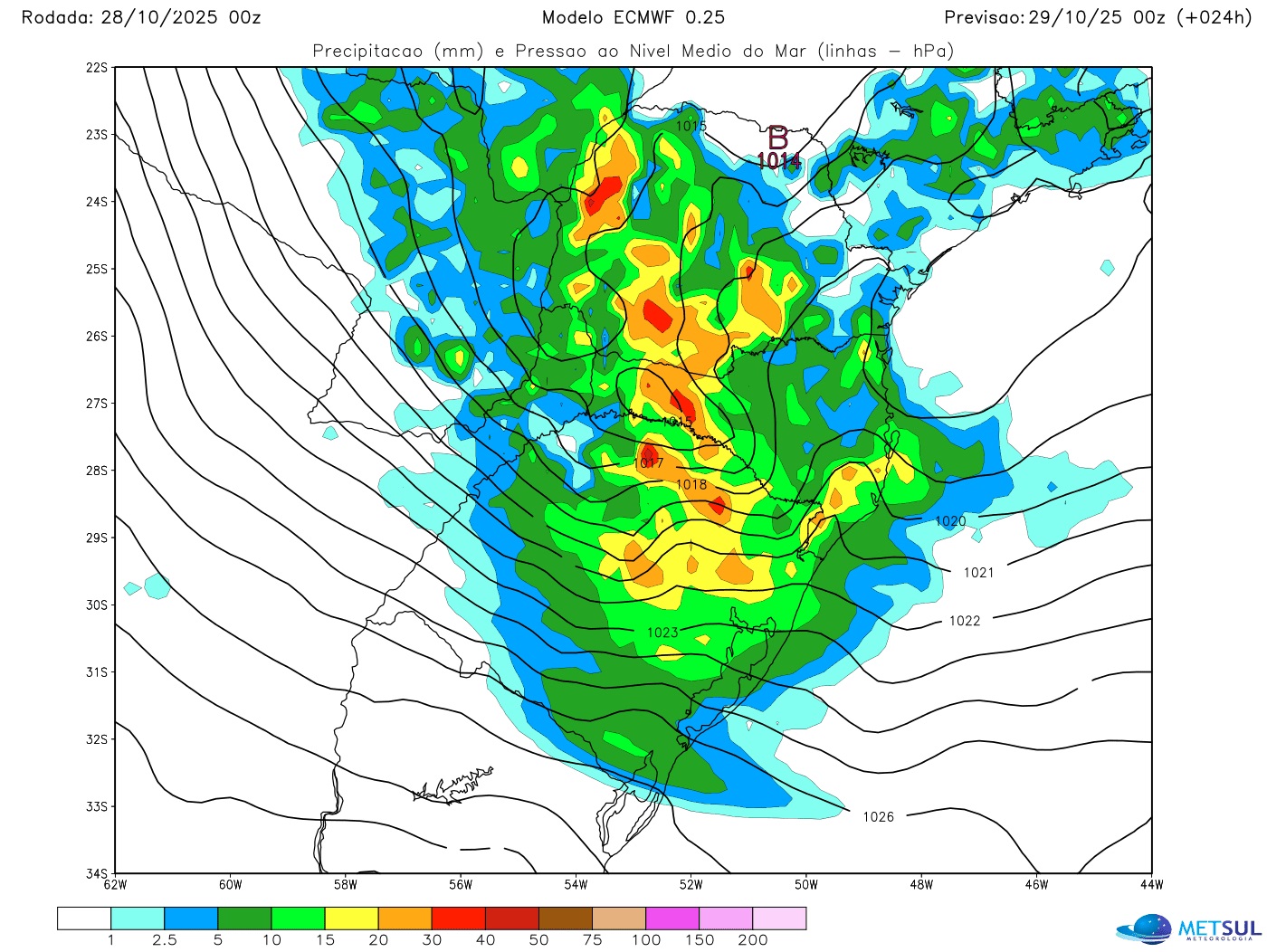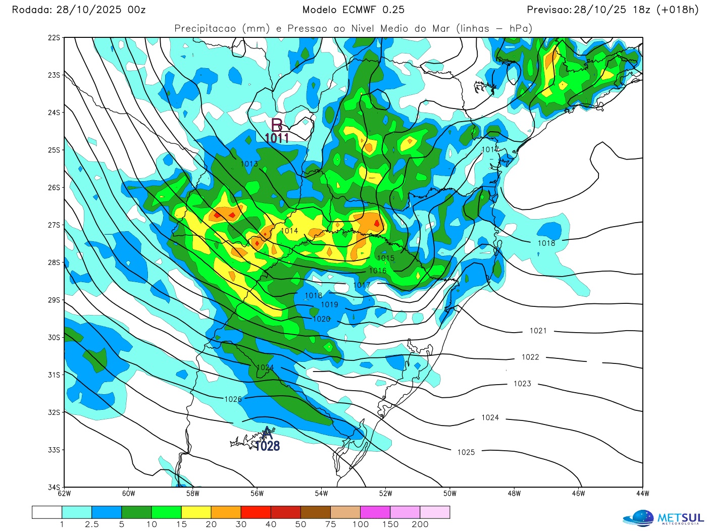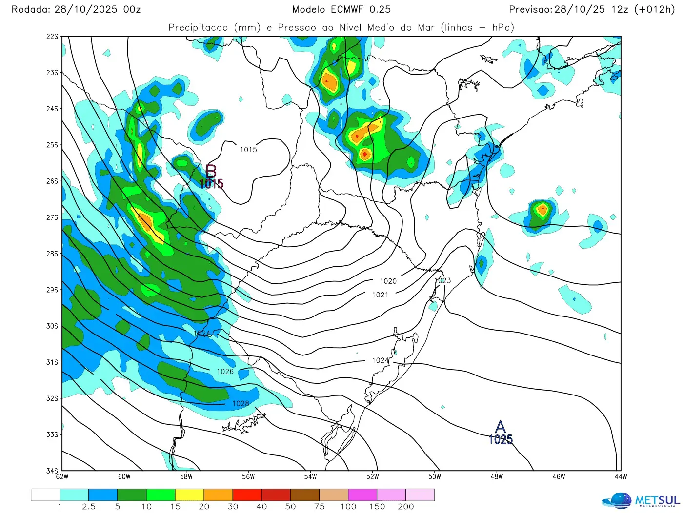 Um centro de baixa pressão avança do Paraguai e do Nordeste da Argentina para o Sul do Brasil nesta terça-feira e instabiliza a atmosfera com chuva e risco de temporais em pontos isolados nos três estados da região no decorrer do dia.