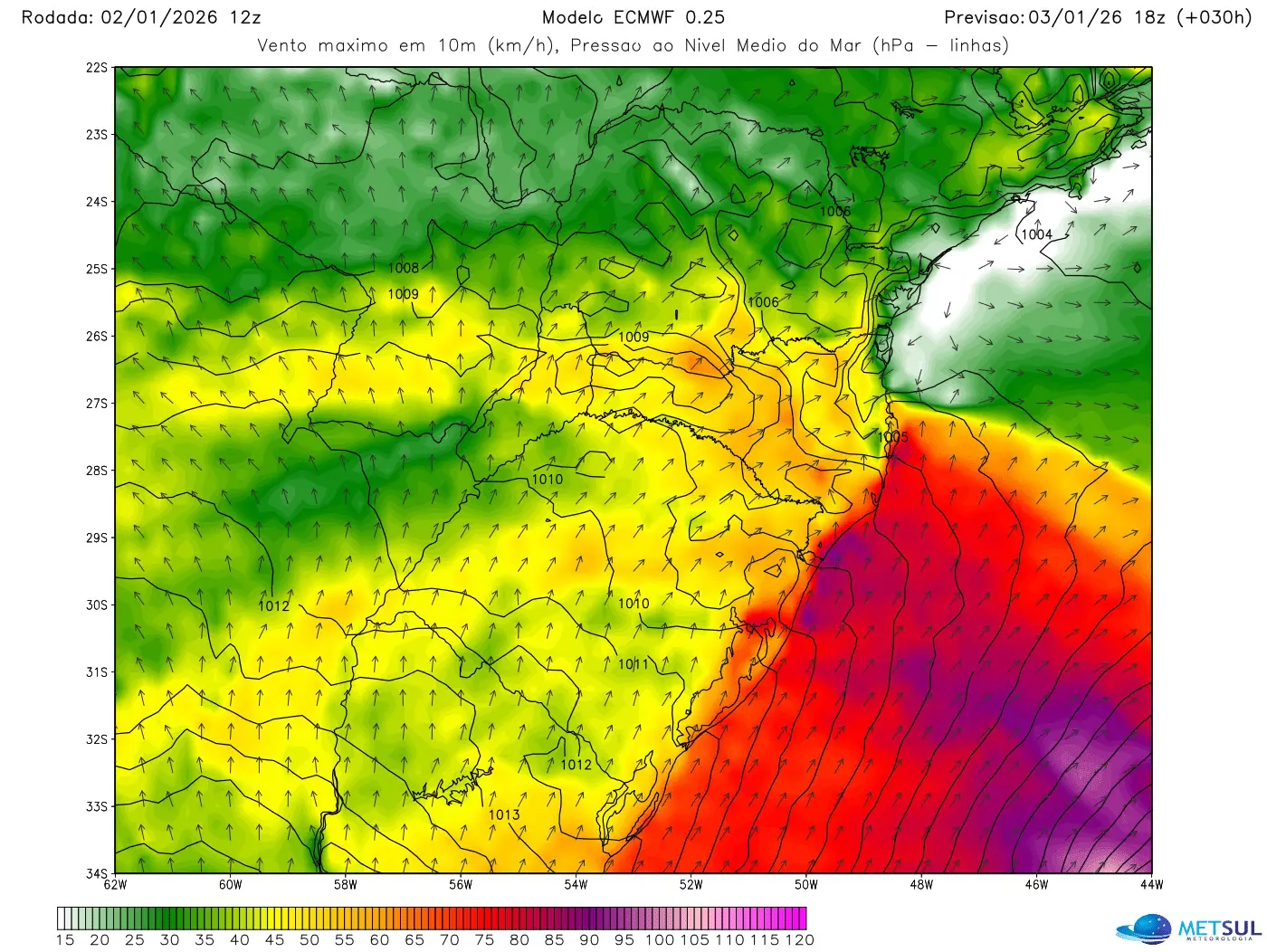 A formação e o aprofundamento de uma área de baixa pressão sobre o Oceano Atlântico vai trazer vento forte a intenso neste sábado na região do Rio da Prata e ainda no Leste do Rio Grande do Sul, Santa Catarina e o Paraná, podendo chegar ao litoral de São Paulo, alerta a MetSul Meteorologia.