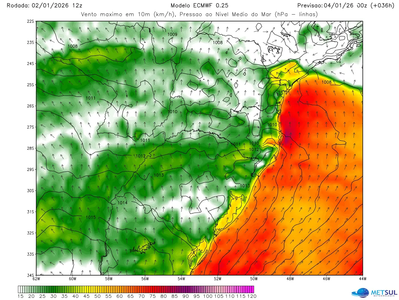 No Litoral Norte, as rajadas devem ficar em média entre 60 km/h e 70 km/h, mas podem ser superiores em alguns pontos. No Litoral Sul gaúcho, o vento pode ser mais forte com rajadas de 70 km/h a 80 km/h, porém isoladamente superiores.