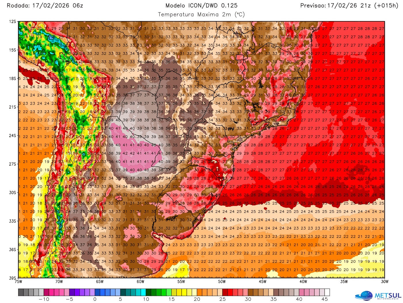 O calor mais extremo associado a este bolsão de ar quente vai se concentrar no Paraguai e no Norte e Nordeste da Argentina, onde são esperadas máximas de 40ºC a 44ºC nesta segunda metade da semana.