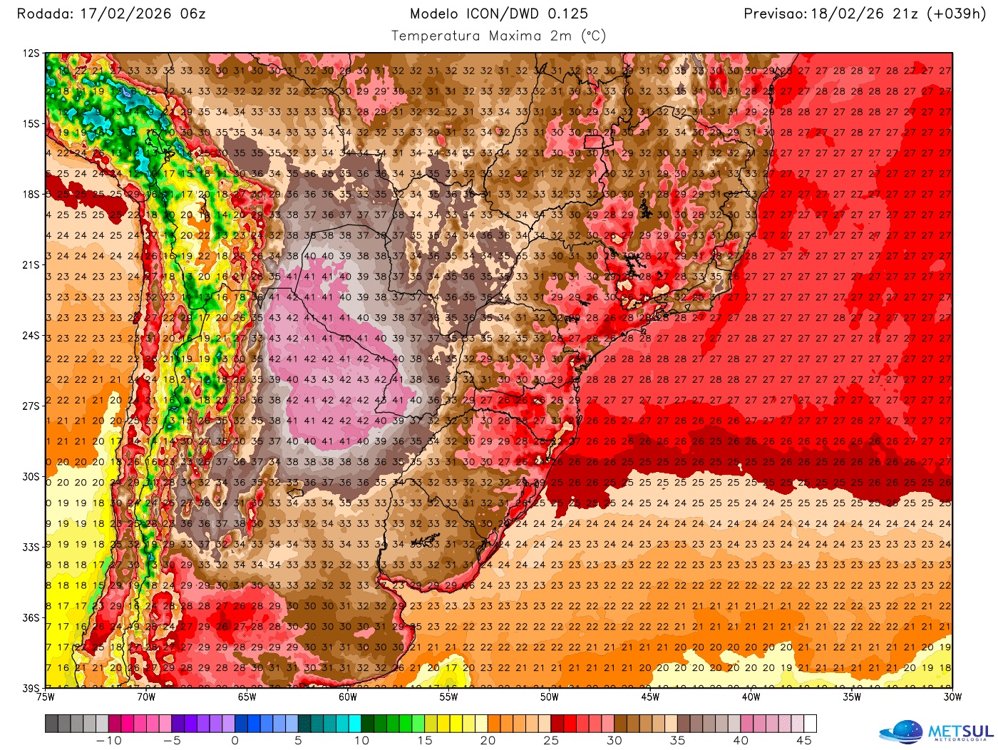 No Sul do Brasil, as maiores máximas nesta segunda metade da semana vão ocorrer no Oeste e Noroeste do Rio Grande do Sul, no Oeste de Santa Catarina, e no Oeste, Noroeste e o Norte do estado do Paraná com máximas em alguns municípios de 37ºC a 39ºC, mas que em algumas localidades podem ficar em torno dos 40ºC.