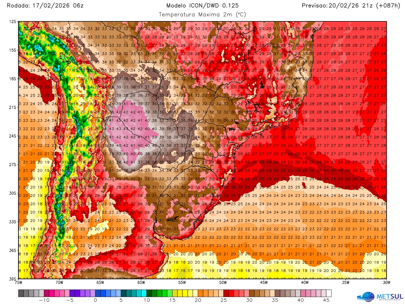 Mapa do modelo alemão Icon com a previsão de máximas para a tarde de hoje | METSUL