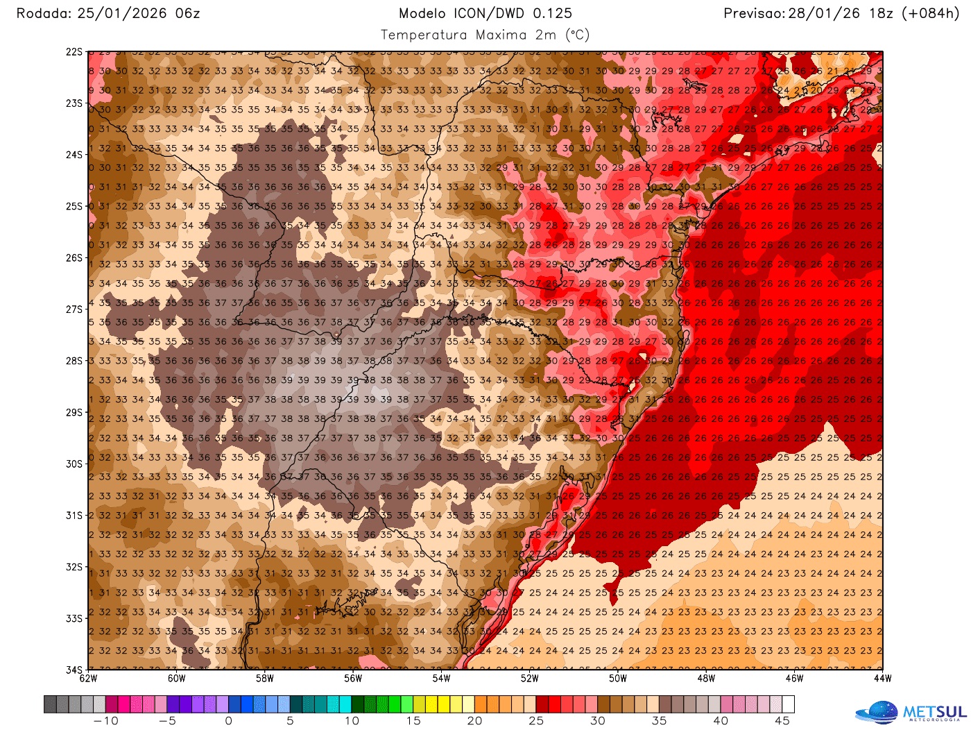 Os dados analisados pela MetSul indicam que o calor tende a ser mais intenso na Metade Oeste, onde são esperados valores extremos em algumas localidades em torno e acima dos 40ºC nesta semana.