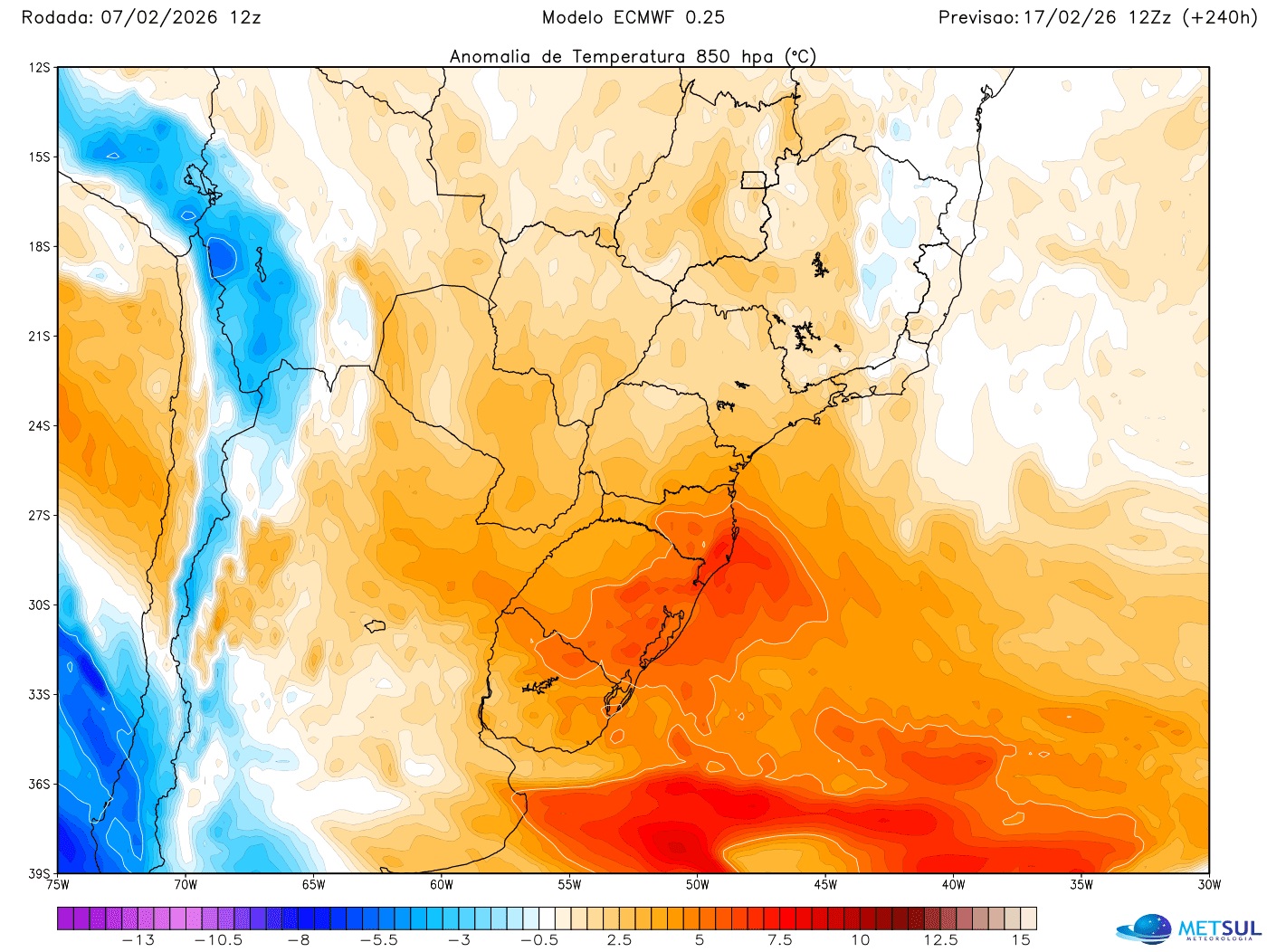 Assim, é possível que esteja se iniciando um período quente no Sul do Brasil que pode perdurar por ao menos dez dias, o que deve fazer com que fevereiro termine com médias de temperatura acima a muito acima da climatologia histórica mensal, em particular no Rio Grande do Sul.