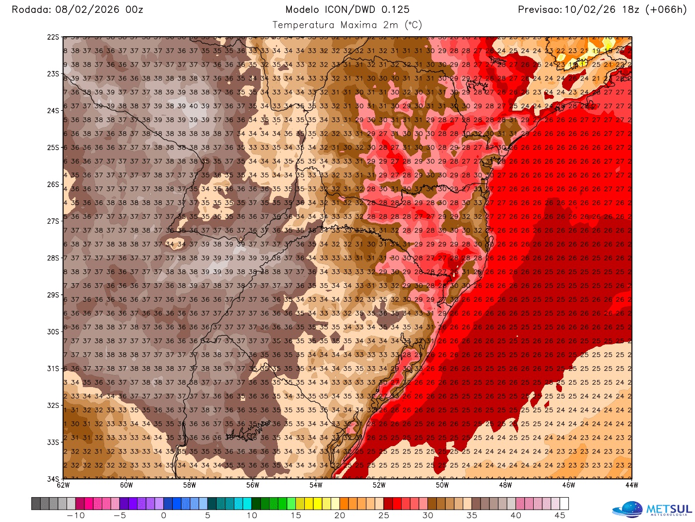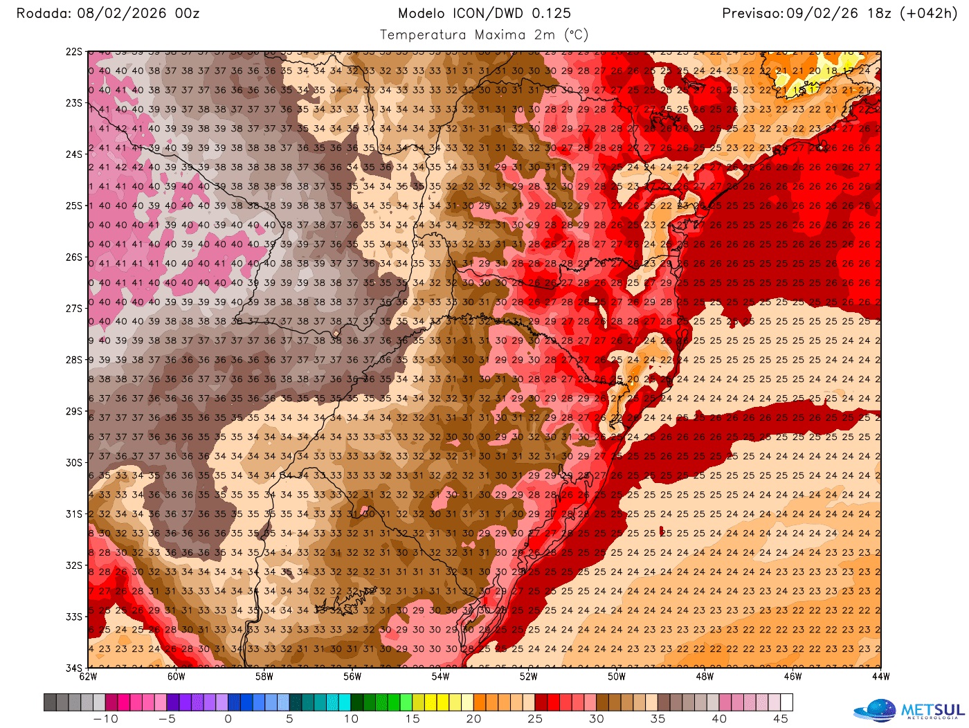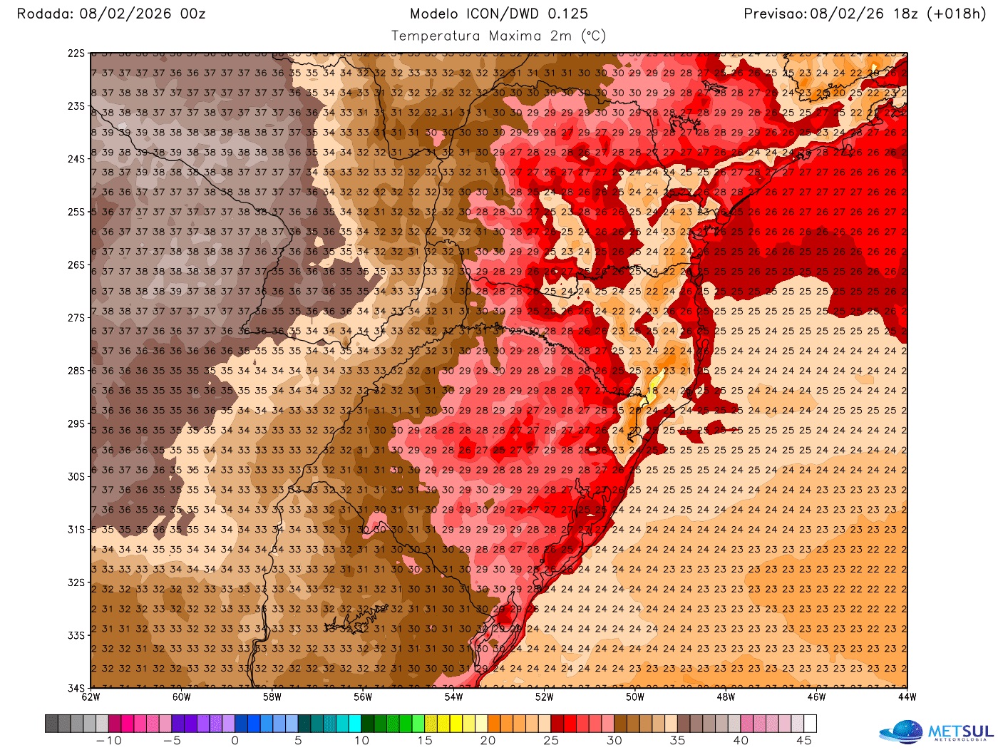 Projeção de máximas do modelo Icon para a tarde de hoje | METSUL