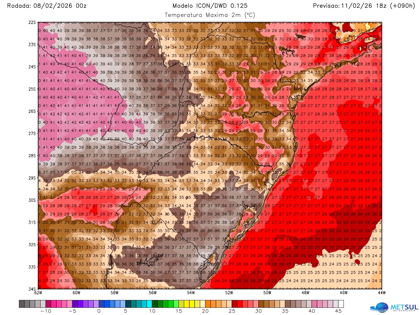 Projeção de máximas do modelo Icon para a tarde de quarta | METSUL