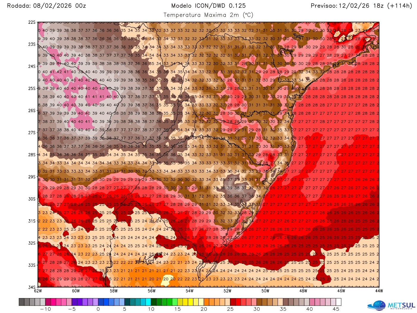 Projeção de máximas do modelo Icon para a tarde de quinta | METSUL