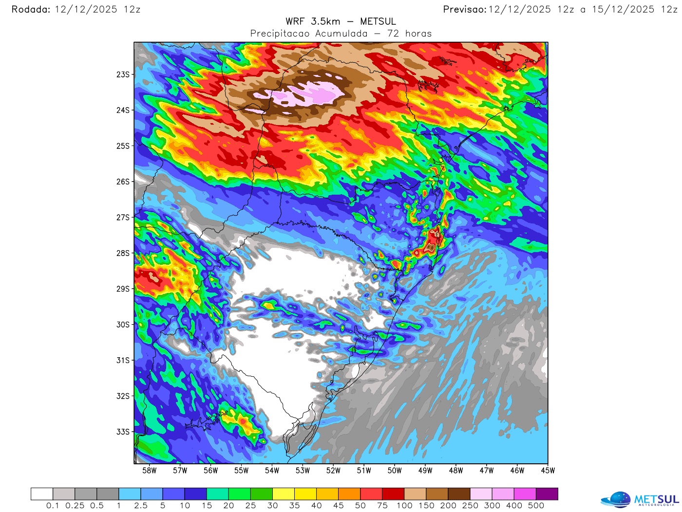 O mapa acima mostra a projeção de chuva acumulada em 72 horas entre 9h desta sexta e 9h de segunda-feira do modelo de alta resolução WRF-GFS da MetSul Meteorologia.