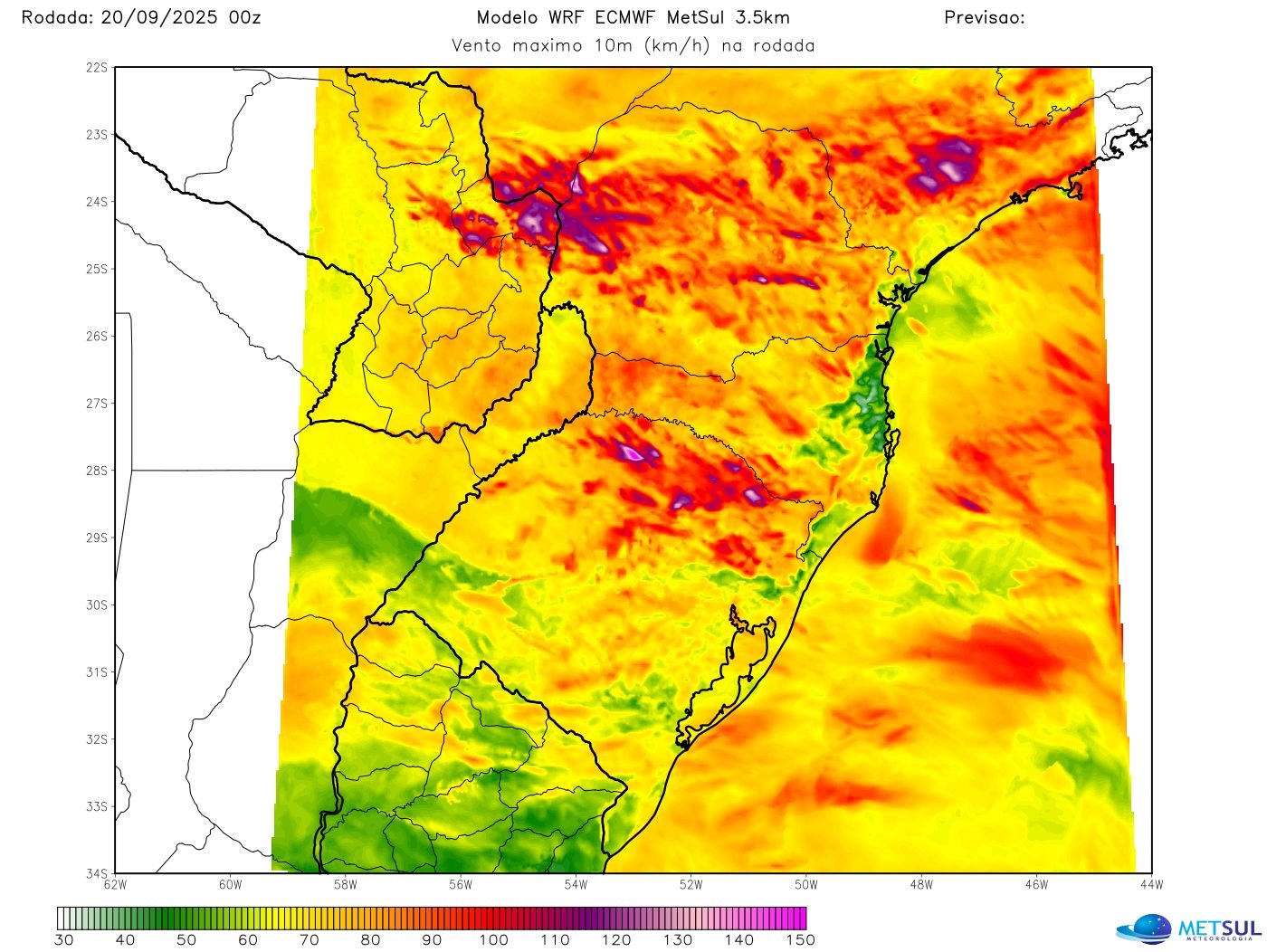 Os mapas a seguir mostram o vento máximo indicado pelos modelo de alta resolução WRF inicializados com os modelos norte-americano e europeu em que se observa muitas áreas com vento perto de 100 km/h, algumas acima de 100 km/h e mesmo pontos muito isolados acima de 120 km/h com rajadas indicadas até 140 km/h ou 150 km/h (severas e destrutivas).