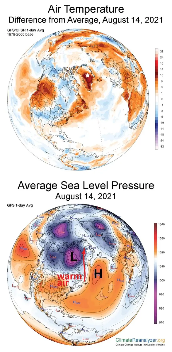 Apenas 2012 e 2021 tiveram mais de um evento de derretimento de 800.000 quilômetros quadrados de extensão e o do dia 14 de agosto de 2021 foi o mais tardio já observado para esta escala de extensão do derretimento nos registros por satélite. A chuva combinada com o ar mais quente trouxe degelo sete vezes superior à média do meio de agosto no último domingo.