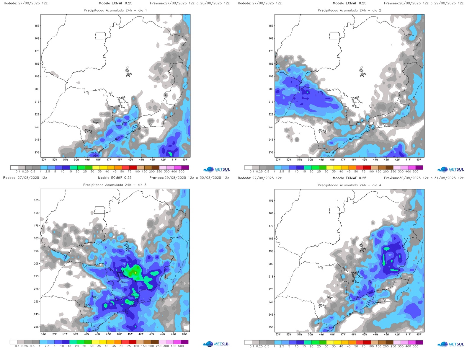 Os mapas abaixo mostram as projeções de chuva em 24 horas, entre 9h da manhã e 9h do dia seguinte, entre esta quinta-feira e o sábado no Sudeste do Brasil com dados do modelo europeu.