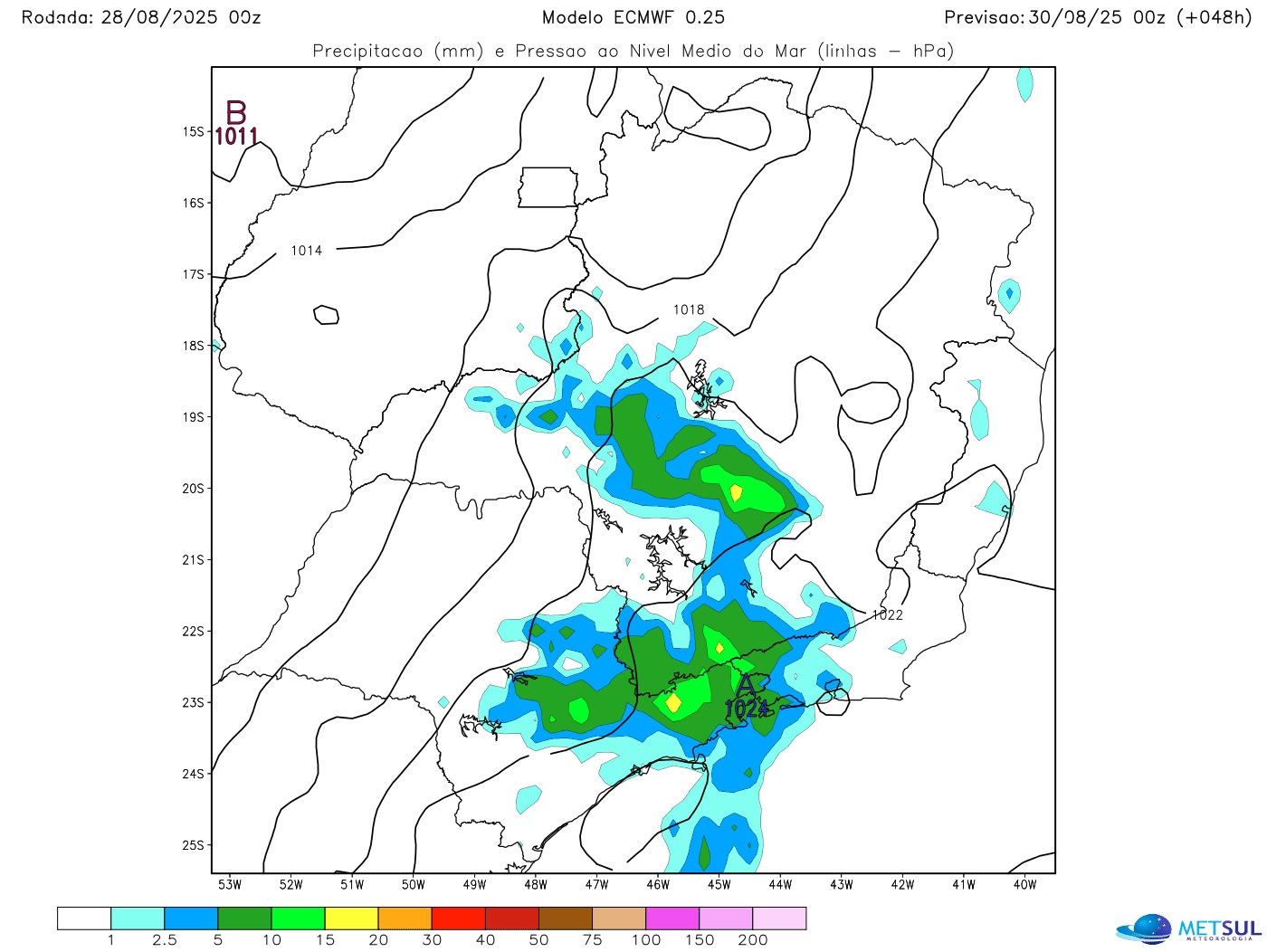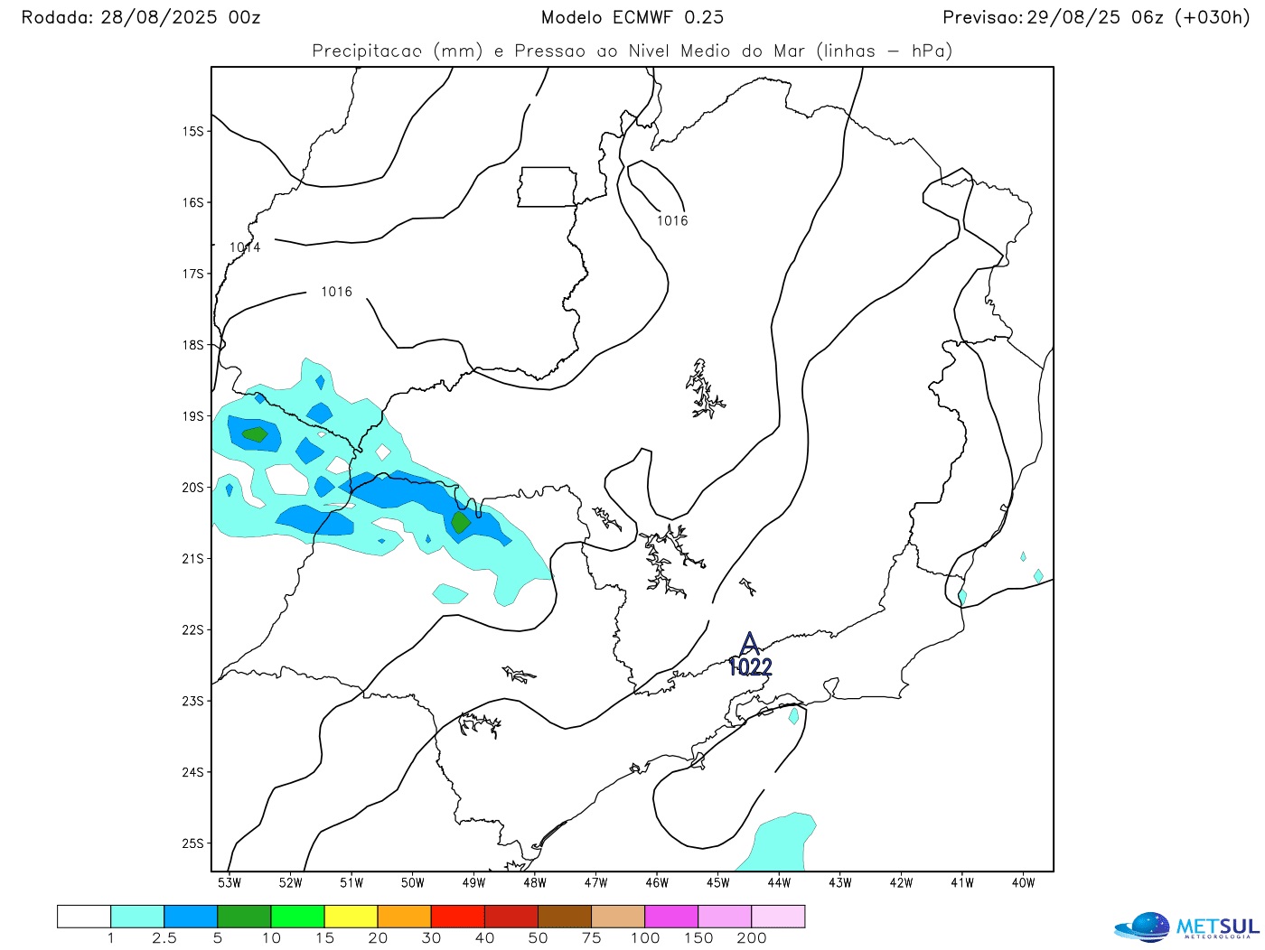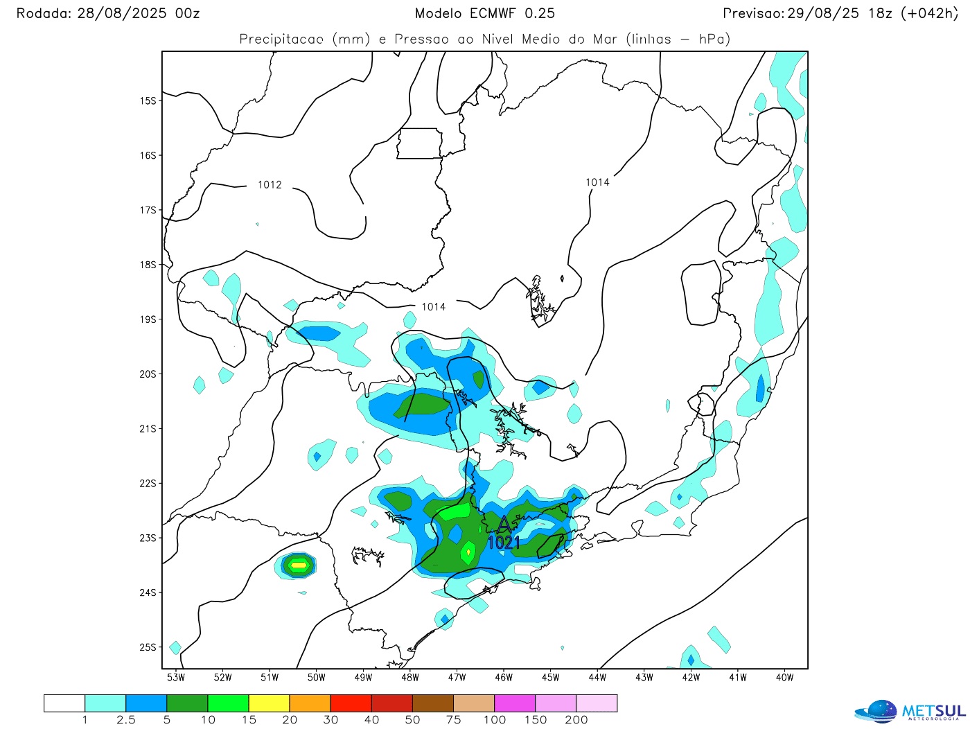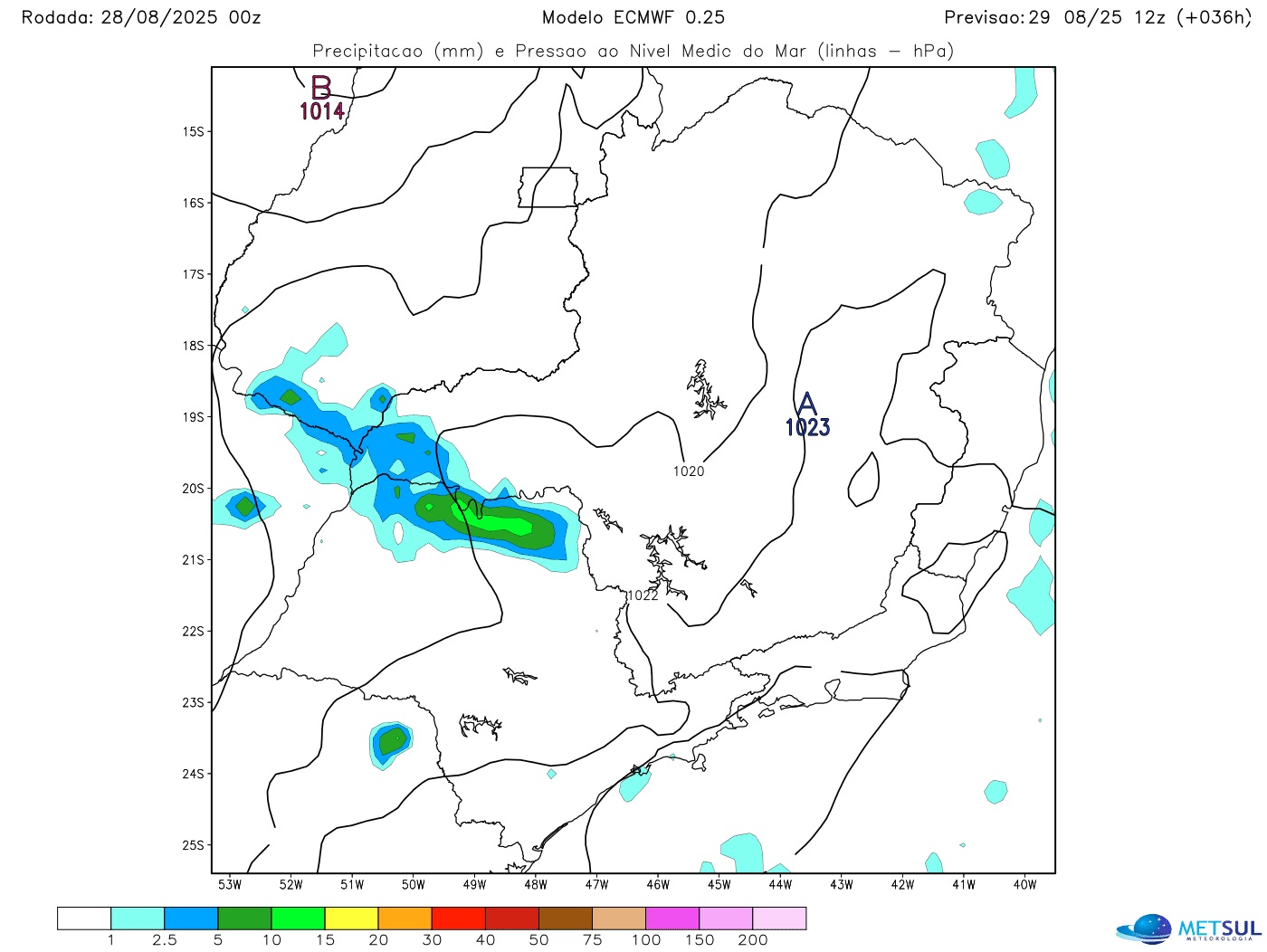 Reiteramos que os volumes de chuva, em geral, no Sudeste do Brasil devem ser baixos. Somente isoladamente há chance de chover moderado a forte com trovoadas. O risco de tempo severo é baixo e quaisquer ocorrências, especialmente de granizo, serão muito localizadas.