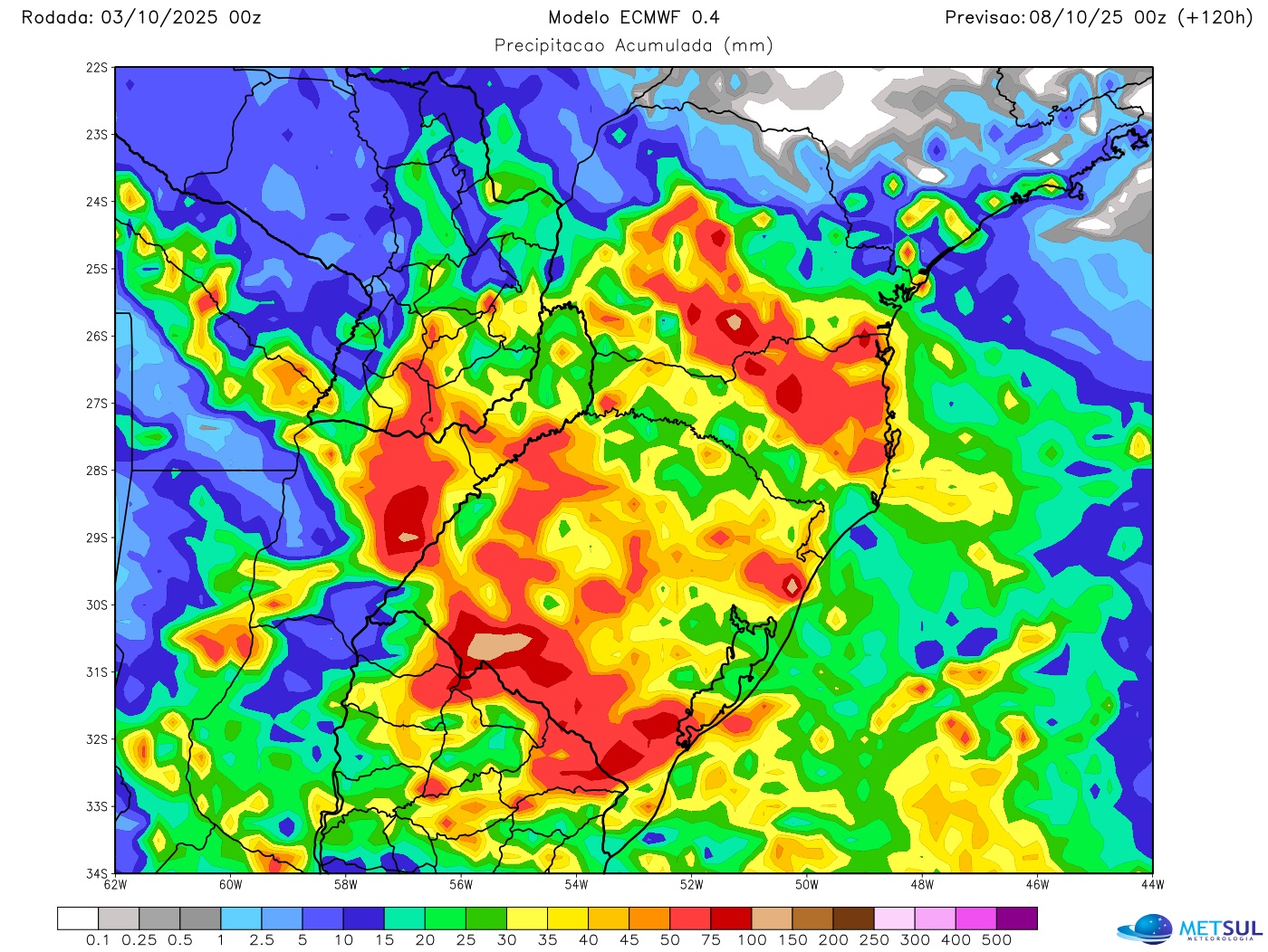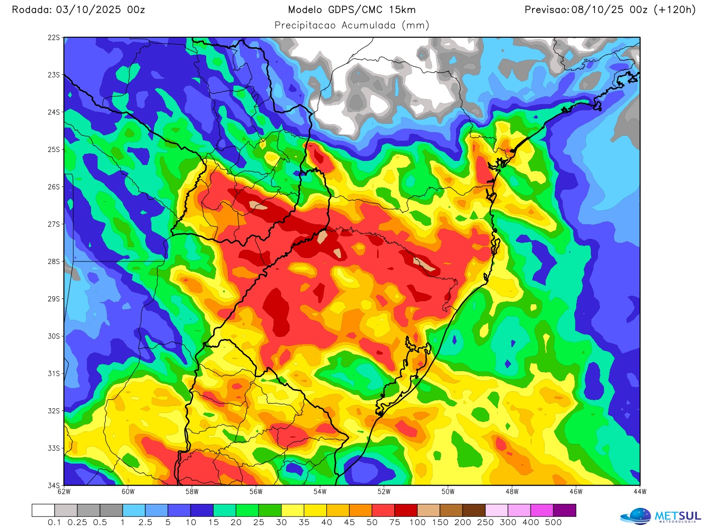 Os volumes de chuva pela soma de vários dias de instabilidade devem passar de 50 mm até segunda em diversos pontos do Rio Grande do Sul e de parte de Santa Catarina com menores acumulados no Paraná.
