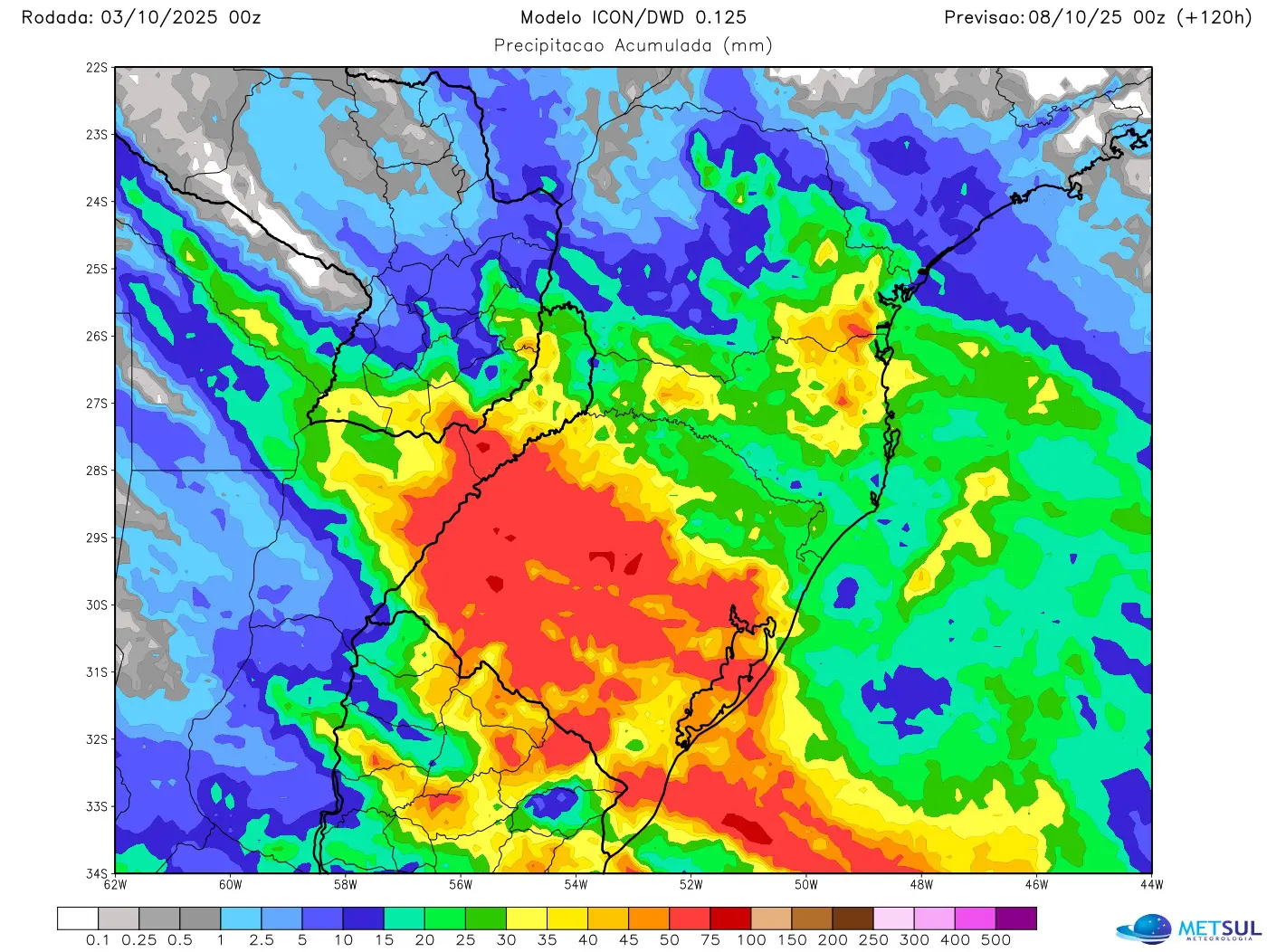 Os volumes de chuva pela soma de vários dias de instabilidade devem passar de 50 mm até segunda em diversos pontos do Rio Grande do Sul e de parte de Santa Catarina com menores acumulados no Paraná.
