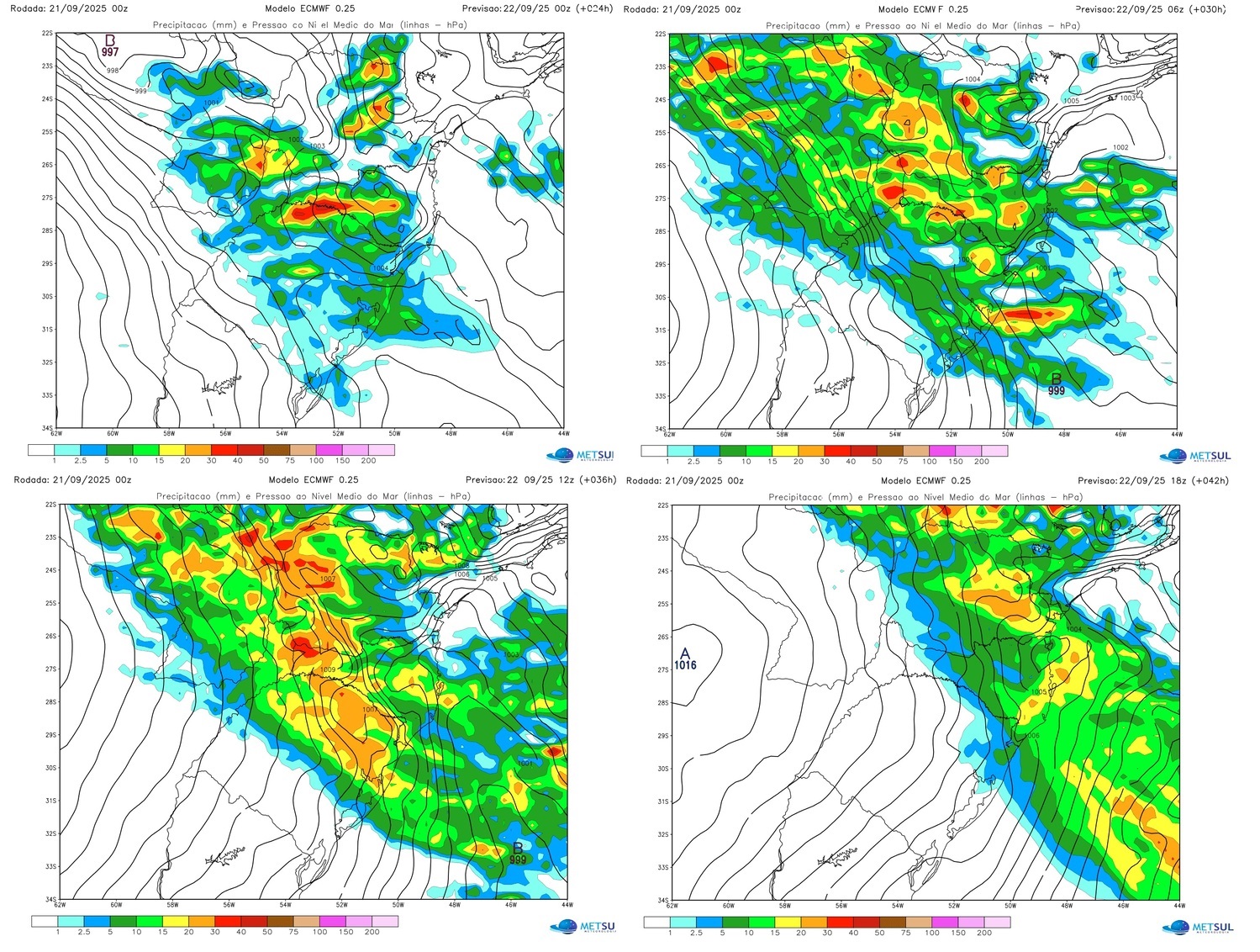 Os mapas a seguir mostram a projeção de chuva do modelo do Centro Meteorológico Europeu (ECMWF) para a noite de hoje e a madrugada, manhã e tarde desta segunda-feira. Os mapas podem ser consultados atualizados pelo nosso assinante na seção de mapas (assine aqui).