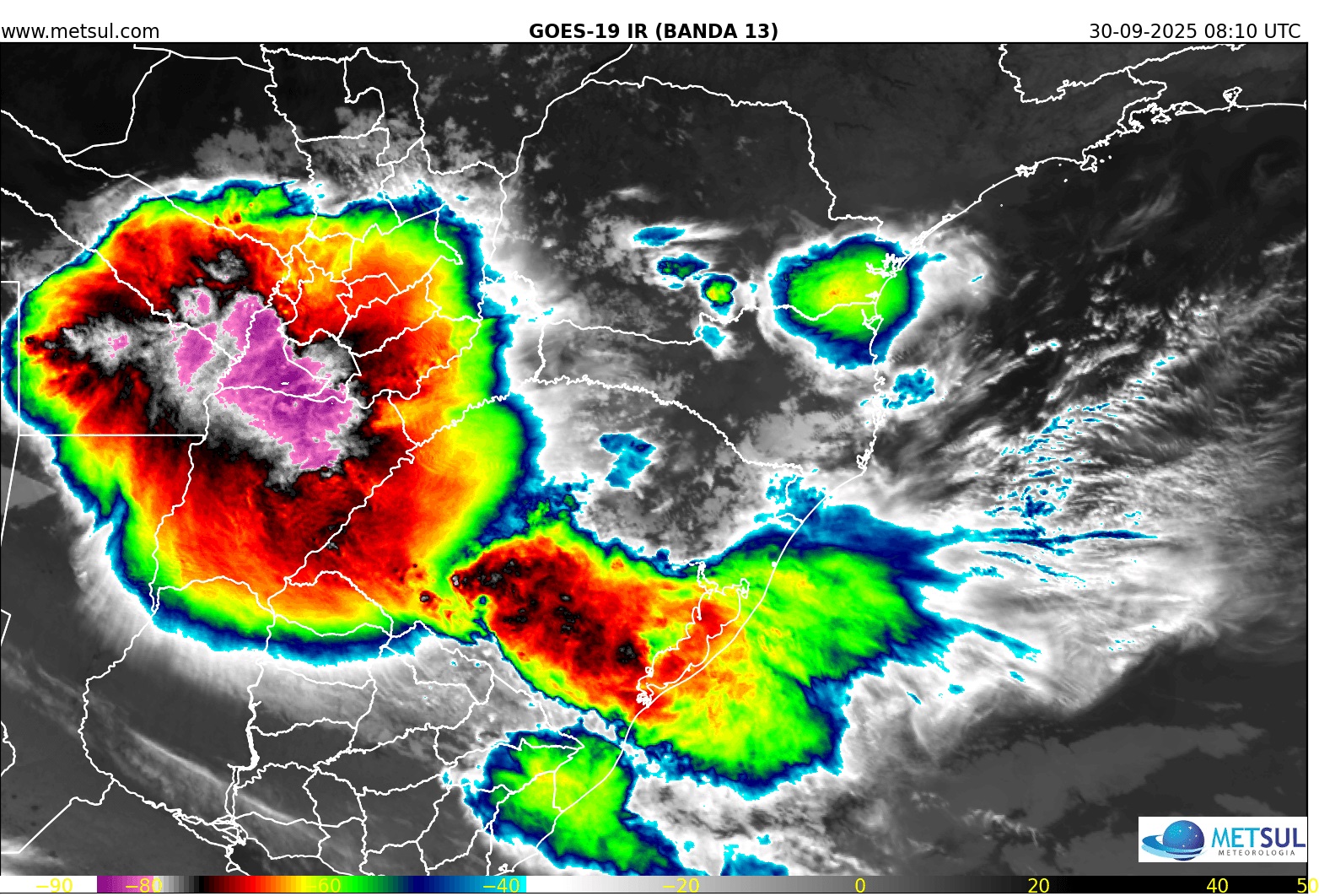 As últimas horas de setembro são de forte instabilidade no Sul do Brasil com formação de nuvens carregadas de grande desenvolvimento vertical que trazem chuva forte em alguns pontos, raios e queda localizada de granizo.