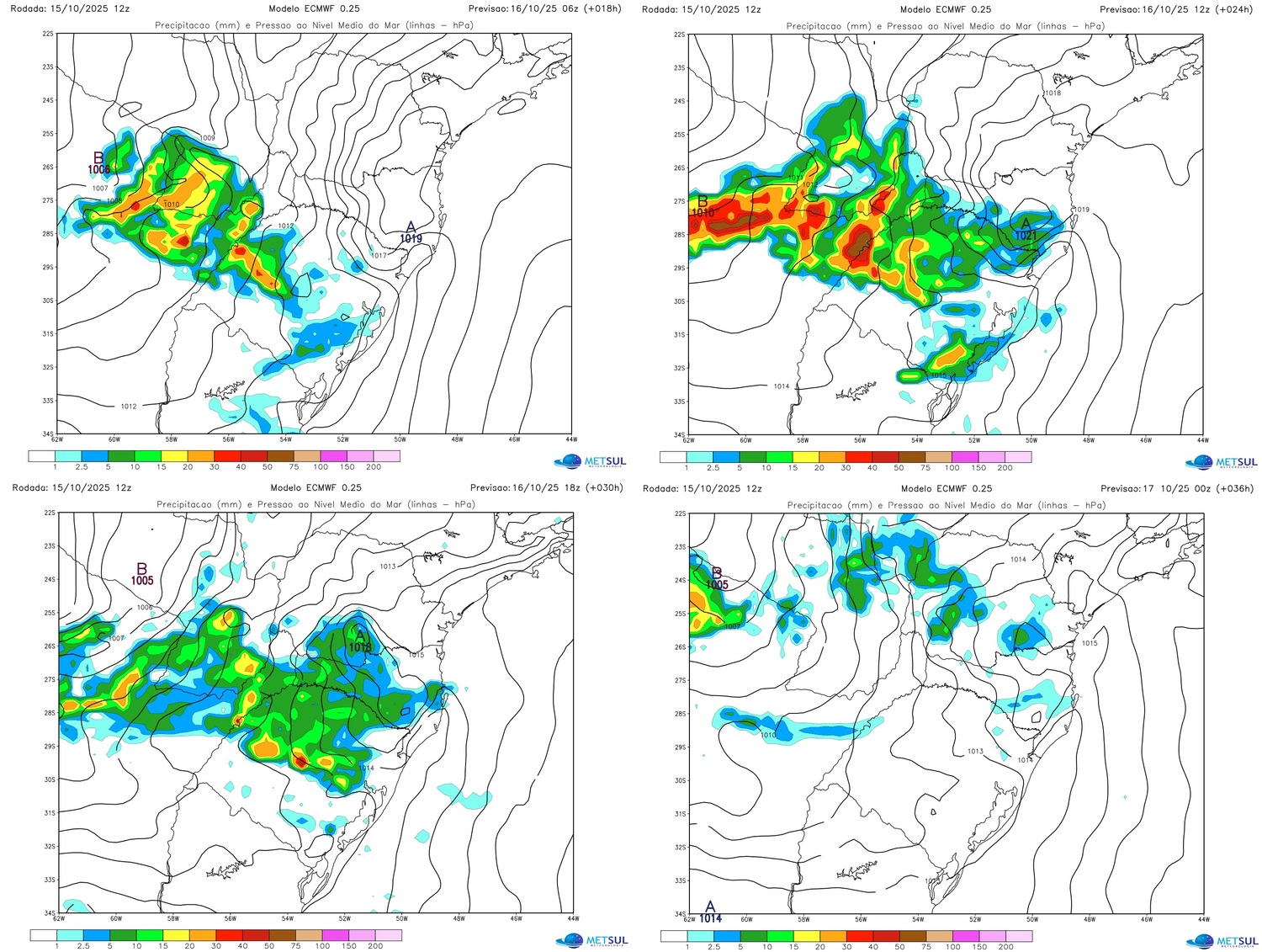Os mapas a seguir mostram a projeção de chuva do modelo do Centro Meteorológico Europeu para a madrugada, manhã, tarde e noite desta quinta-feira. Os mapas podem ser consultados a qualquer hora em nossa plataforma de dados (clique aqui para ter acesso).