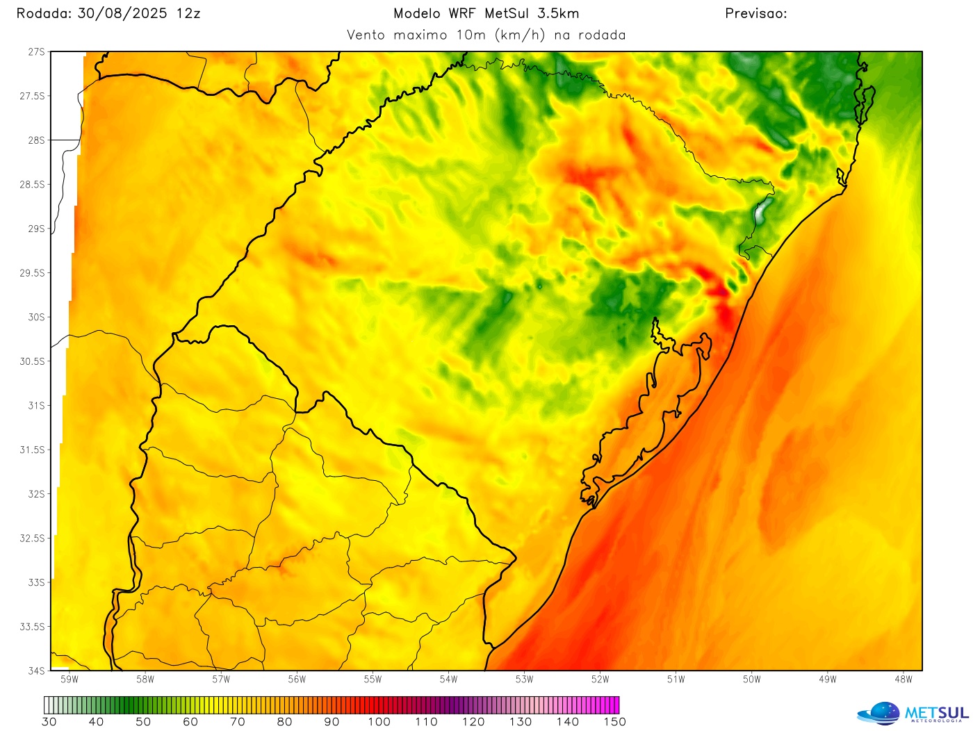 Vento máximo projetado pelo modelo WRF-GFS | METSUL