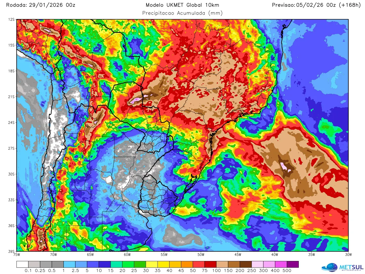 O mapa abaixo mostra a projeção de chuva para sete dias, que compreende a atuação dos dois sistemas, a partir de dados do modelo meteorológico britânico UKMET do Met Office.