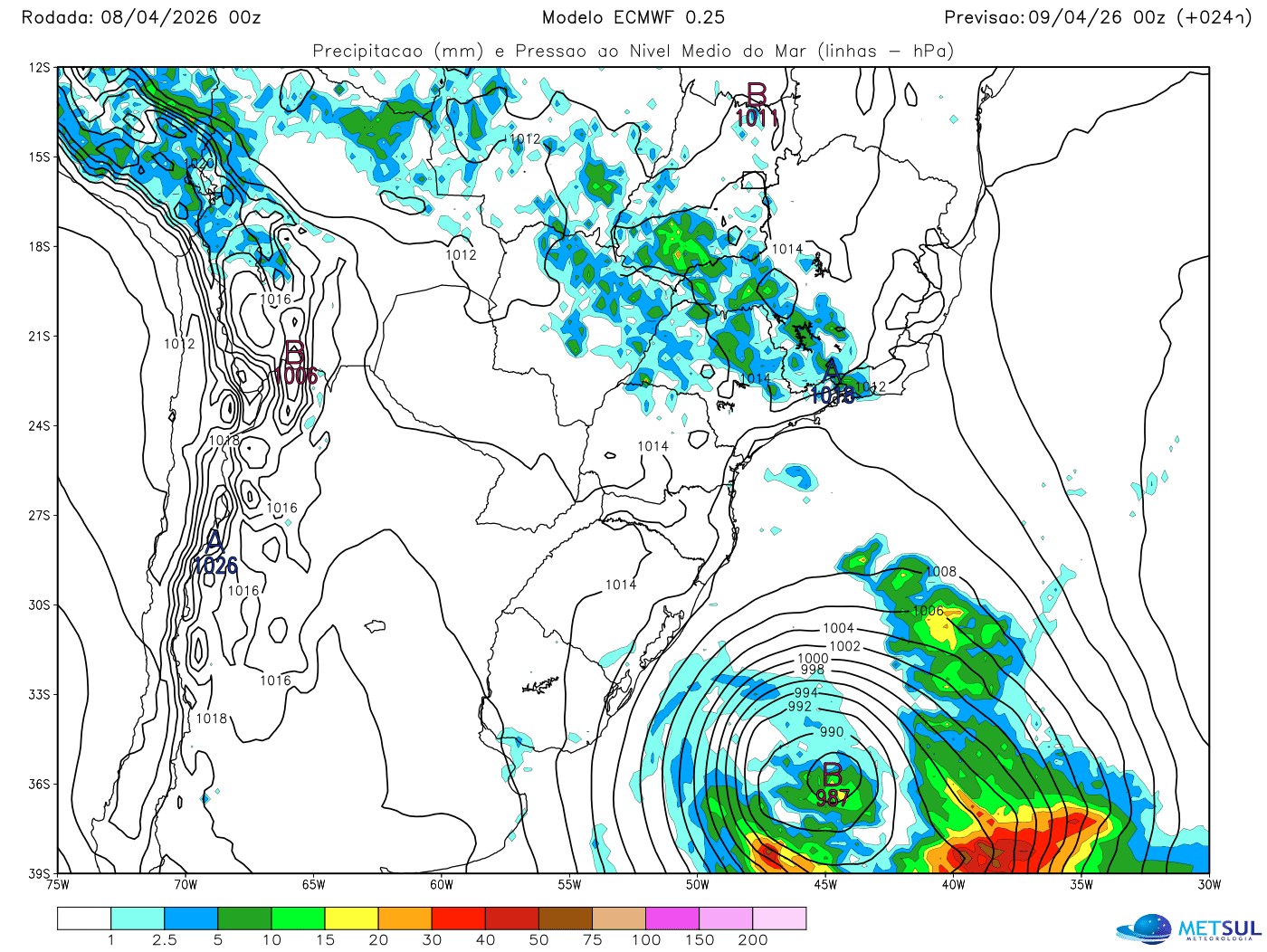 Projeção do modelo europeu da posição do ciclone extatropical identificado pela B na imagem, com pressão 987 em seu centro a sudeste do estado no oceano Atlântico Sul. ECMF/METSUL