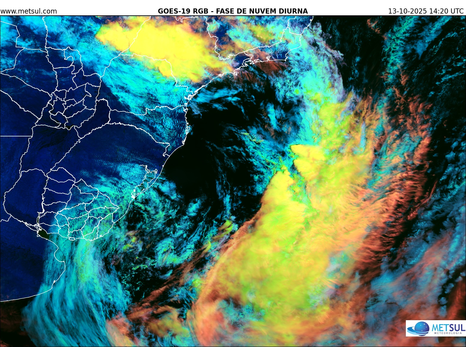 A imagem do satélite meteorológico GOES-19 de mais cedo mostra a espiral de nuvens clássica de ciclones com o vórtice sobre o Uruguai e o Sul gaúcho, onde trazia mais nuvens acompanhadas de vento.