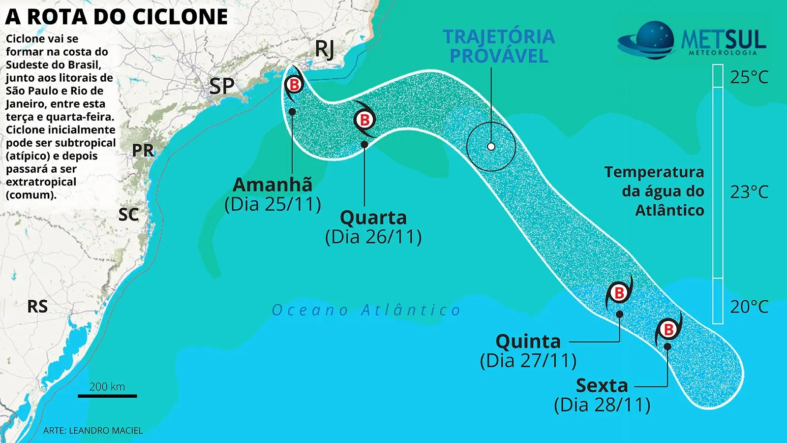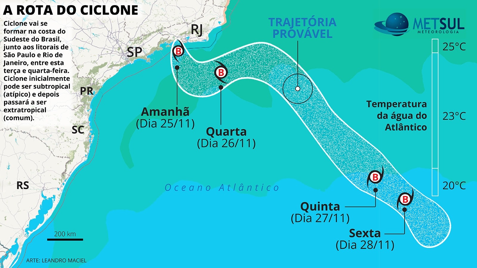 Amanhã (25), inicia-se a ciclogênese propriamente dita, com o sistema ganhando força e ainda perto do continente. Nessa fase, o ciclone deve provocar chuva no Leste paulista, no Rio de Janeiro, no Norte e Leste de Minas Gerais e no Espírito Santo. Especialmente no território capixaba, há risco de chuva forte e temporais.