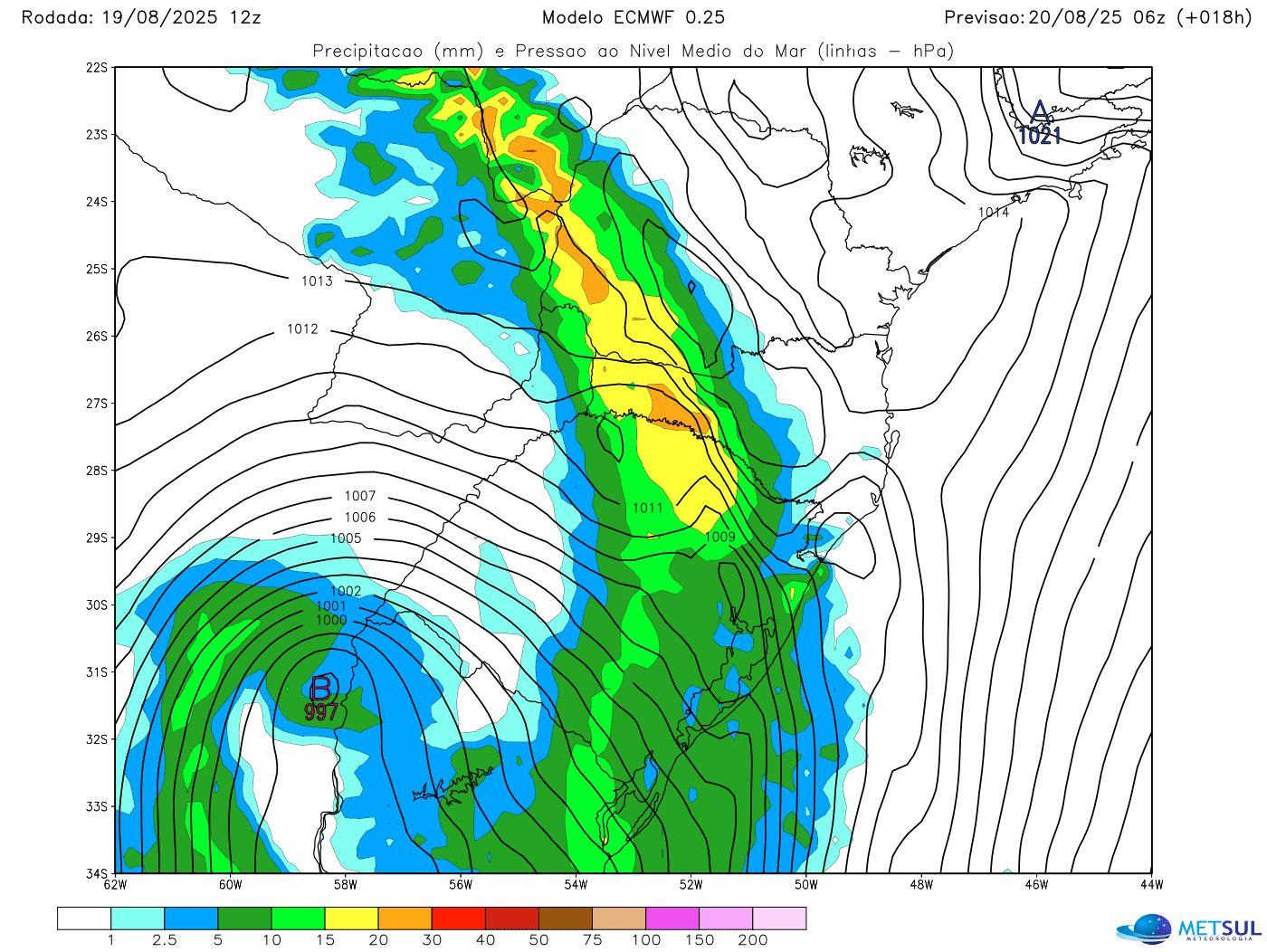 Ciclone extratropical estará nesta quarta-feira na altura do Rio da Prata com 990 hPa e traz mais um dia de instabilidade para o Rio Grande do Sul. Na madrugada e começo da manhã, linha de instabilidade associada ao ciclone avança de Oeste para Leste e traz chuva para todas as regiões gaúchas com risco de alguns temporais isolados.