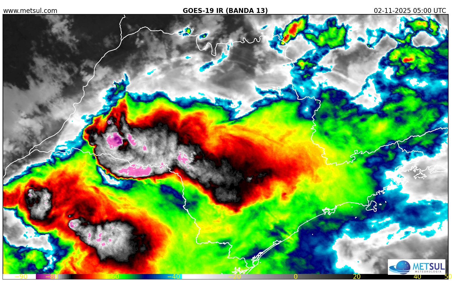 A imagem do satélite meteorológico GOES-19 da NOAA/NASA indicava a presença de nuvens em que a temperatura no topo atingia 80ºC a 85ºC abaixo de zero, ou seja, eram nuvens gigantescas de tempestade e que atingiam enormes altitudes.