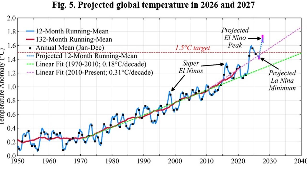 Essa previsão se confirmou. Agora, com base em novos dados e modelos climáticos, Hansen afirma que a temperatura média global deve atingir um mínimo temporário em torno de 1,4°C no primeiro semestre de 2026 e partir daí a tendência será de uma nova elevação, impulsionada por um novo episódio de El Niño, que pode se desenvolver na segunda metade de 2026 e avançar por 2027.