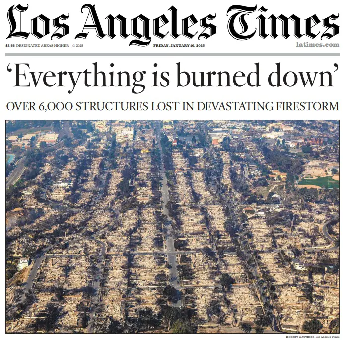 Capa do jornal Los Angeles Times de hoje sobre os incêndios | REPRODUÇÃO
