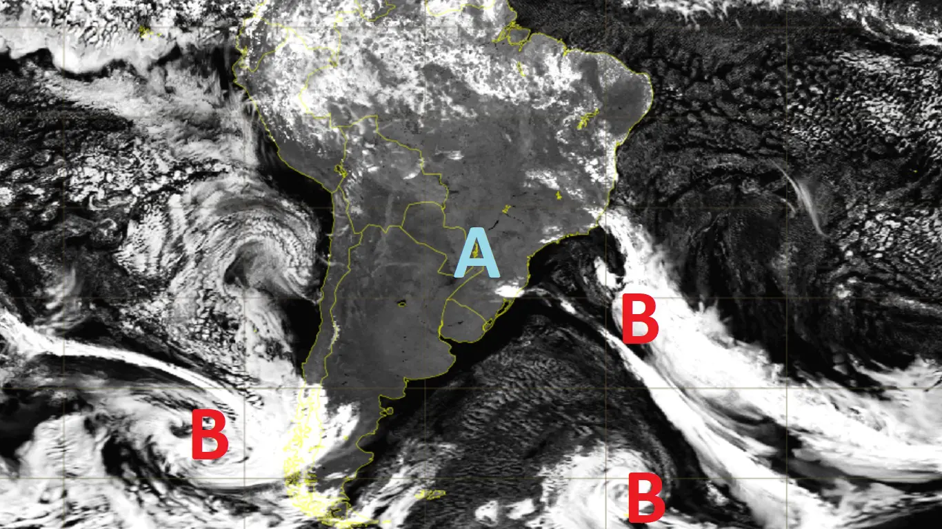 A tendência indica um centro de alta pressão (A) sobre o Sul do Brasil com o predomínio do tempo firme e do afastamento de uma baixa pressão (B) que hoje está no litoral do Paraná para mar aberto, gerando instabilidade em áreas mais a Leste do Sudeste do país.