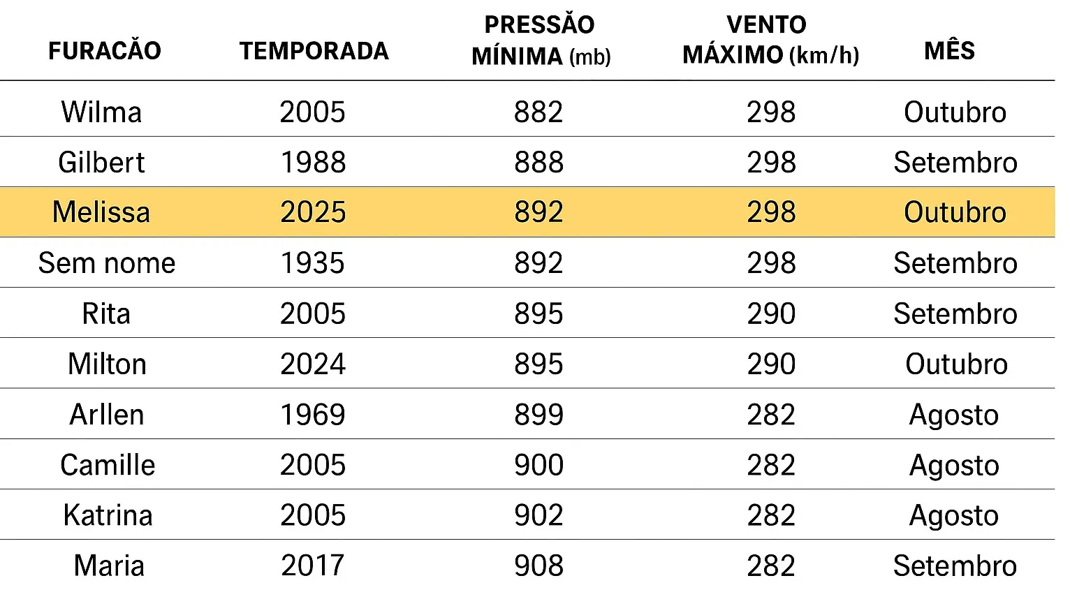 Ao atingir terra, Melissa era um furacão categoria 5 – máximo da escala – e apresentava vento sustentado de 298 km/h e rajadas de até 300 km/h com pressão mínima central de apenas 892 hPa.