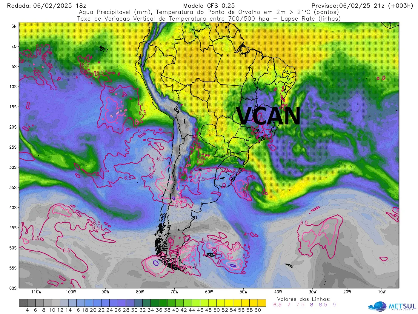 Além disso, em mais baixos níveis, a umidade da Amazônia é canalizada de Norte para Sul a Oeste do VCAN pelos estados do Centro-Oeste até São Paulo e o Paraná. Com a atmosfera quente e úmida, temporais isolados com chuva intensa são mais favorecidos da tarde para a noite.