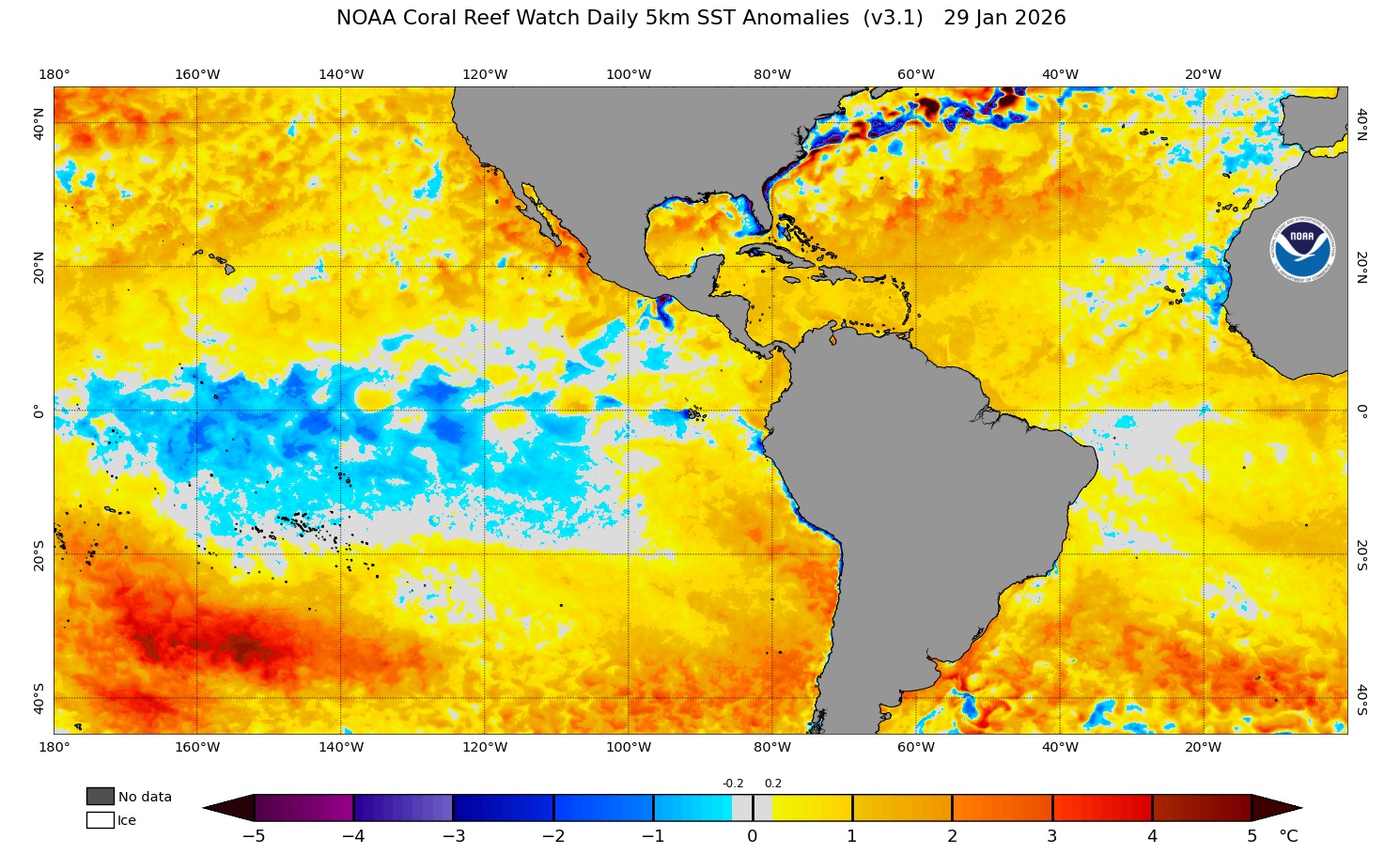 O último boletim semanal sobre o estado do Pacífico da agência climática dos Estados Unidos, publicado no começo desta semana, indicou que a anomalia de temperatura da superfície do mar era de -0,3ºC na denominada região Niño 3.4, no Pacífico Equatorial Centro-Leste.