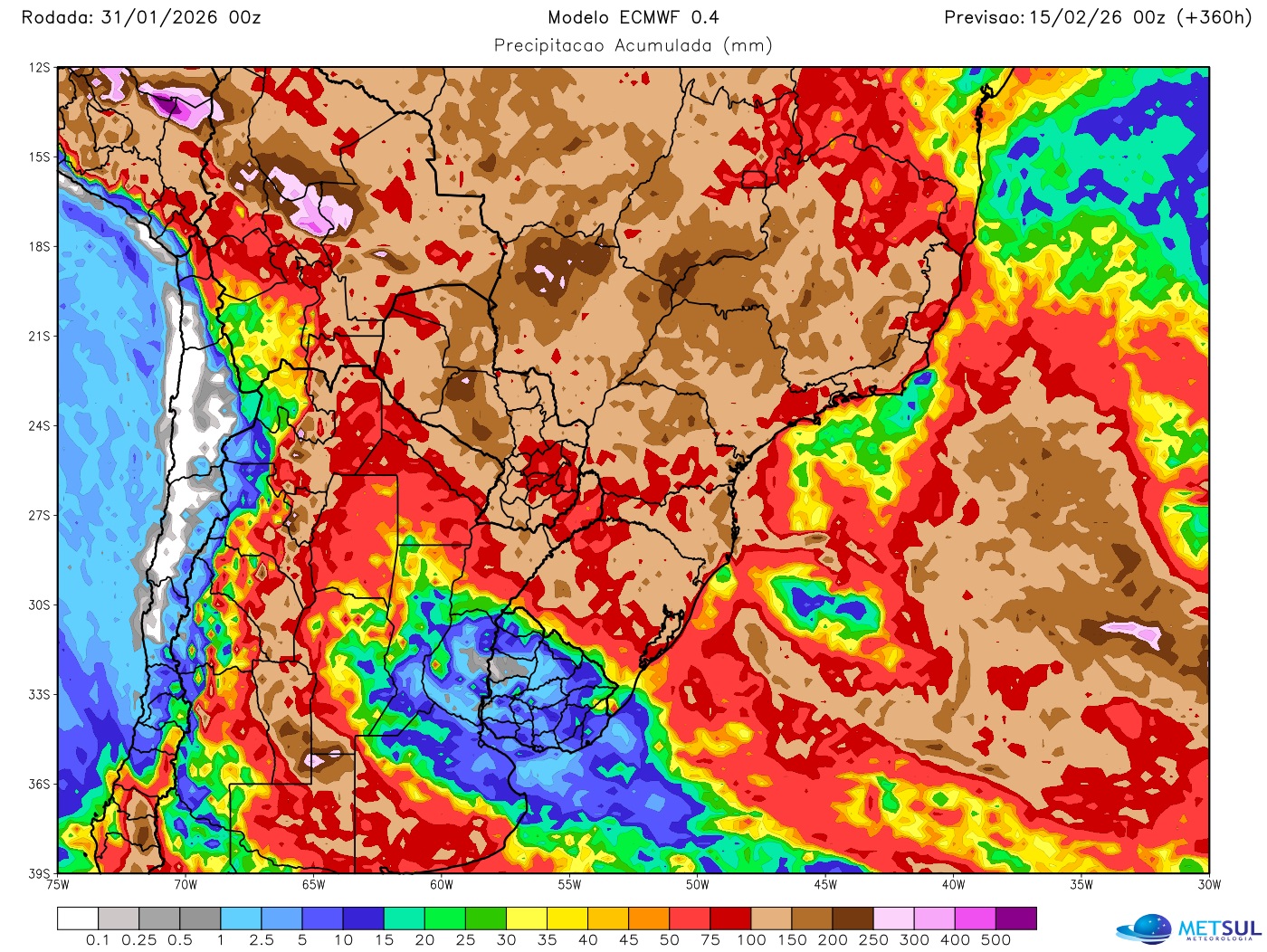 Projeção de chuva acumulada do modelo europeu até 15 de fevereiro | METSUL