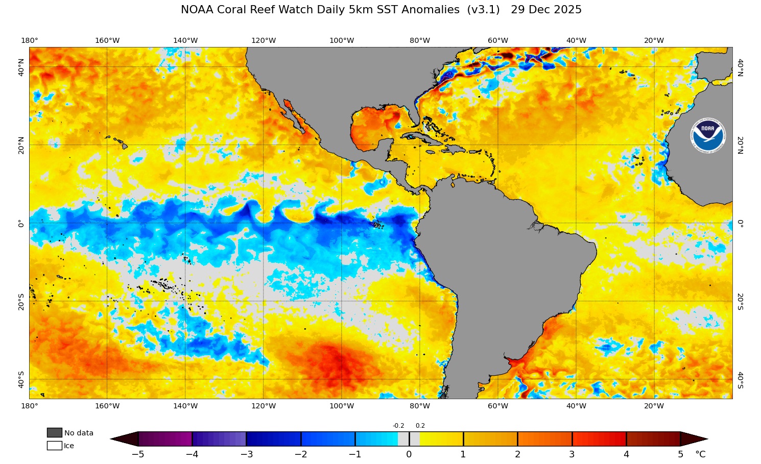 Hoje, de acordo com o último boletim da Administração Nacional de Oceanos e Atmosfera (NOAA), dos Estados Unidos, a anomalia de temperatura da superfície do mar no Pacífico Equatorial Central-Leste (região Niño 3.4) está em -0,7ºC. O valor está no limite inferior da faixa de La Niña fraco (-0,5ºC a -0,9ºC).
