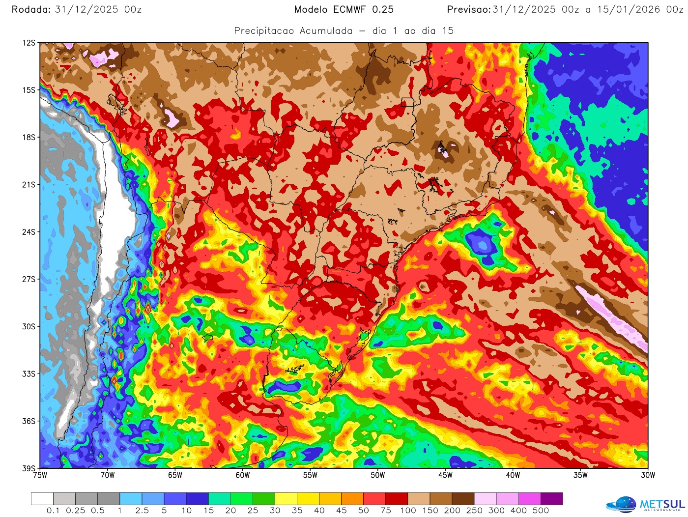 Já o mapa a seguir apresenta a projeção de chuva acumulada na primeira quinzena de dezembro, desta vez pelo modelo de previsão do tempo do Centro Meteorológico Europeu (ECMWF).