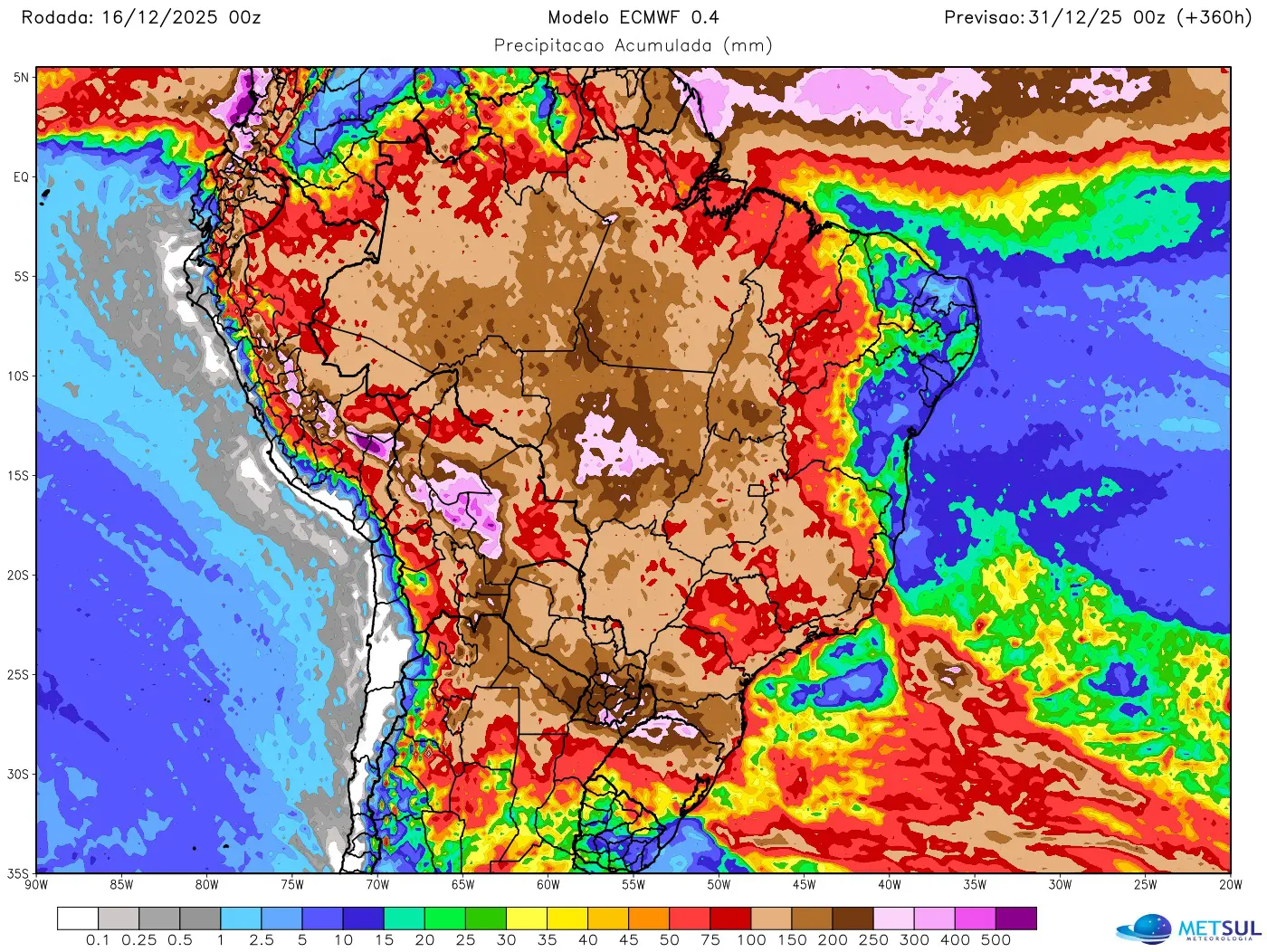 O mapa a seguir mostra a projeção de chuva acumulada em 15 dias do modelo do Centro Meteorológico Europeu (ECMWF), que pode ser consultada diariamente pelo nosso assinante (assine aqui) na seção de mapas da MetSul Meteorologia.