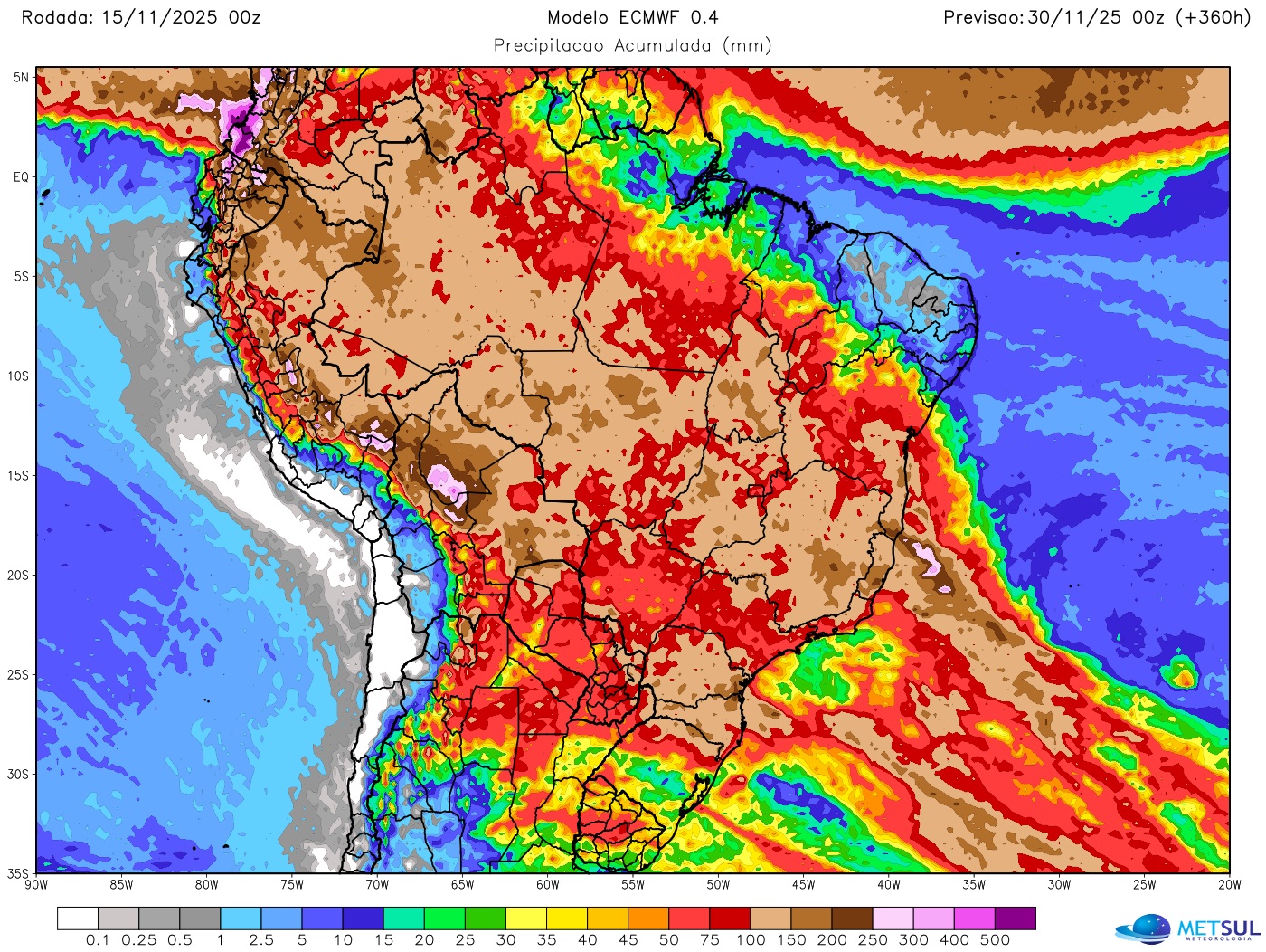 No Sudeste, Minas Gerais em particular deve ter clima mais úmido com os maiores volumes de chuva durante esta segunda quinze de novembro e possibilidade de acumulados localmente muito altos. Em São Paulo, haverá maior variabilidade de volumes, embora pontos localizados possam ter volumes altos.