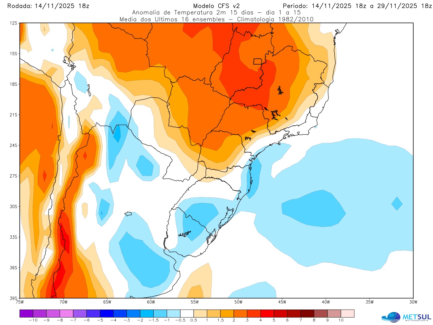No Sul, o Paraná tem uma maior tendência no clima para temperaturas acima da média, exceto o litoral. No Rio Grande do Sul e Santa Catarina, a probabilidade maior é de temperatura próxima da média com alguns pontos apresentando pequenos desvios negativos da climatologia.