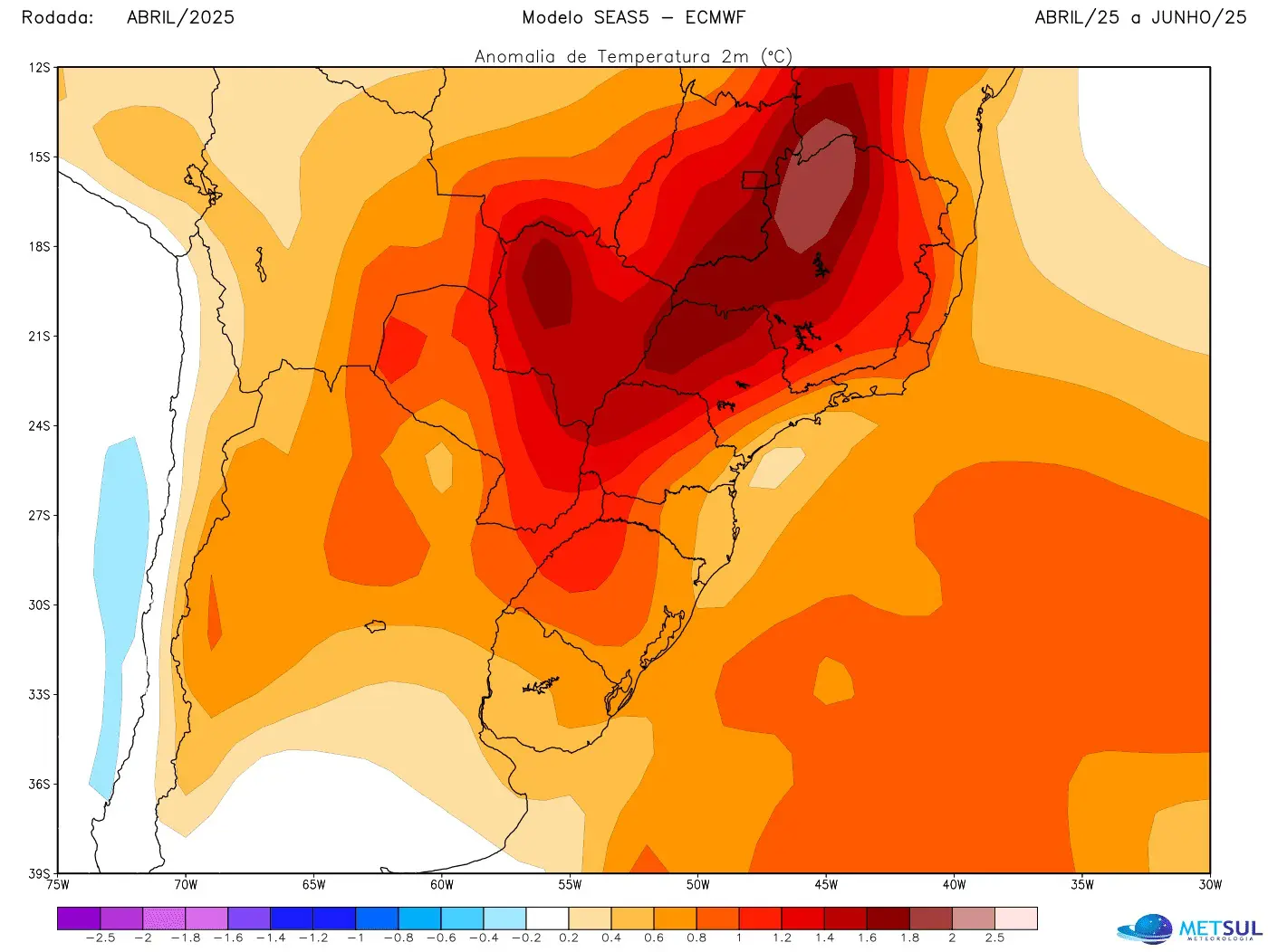Os mapas a seguir mostram as projeções de anomalia (desvio da média) de temperatura para abril a junho do modelo SEAS5 do Centro Meteorológico Europeu (ECMWF) e do NMME. Os mapas não necessariamente representam o prognóstico climático da MetSul que leva em conta outros modelos e análises de clima.