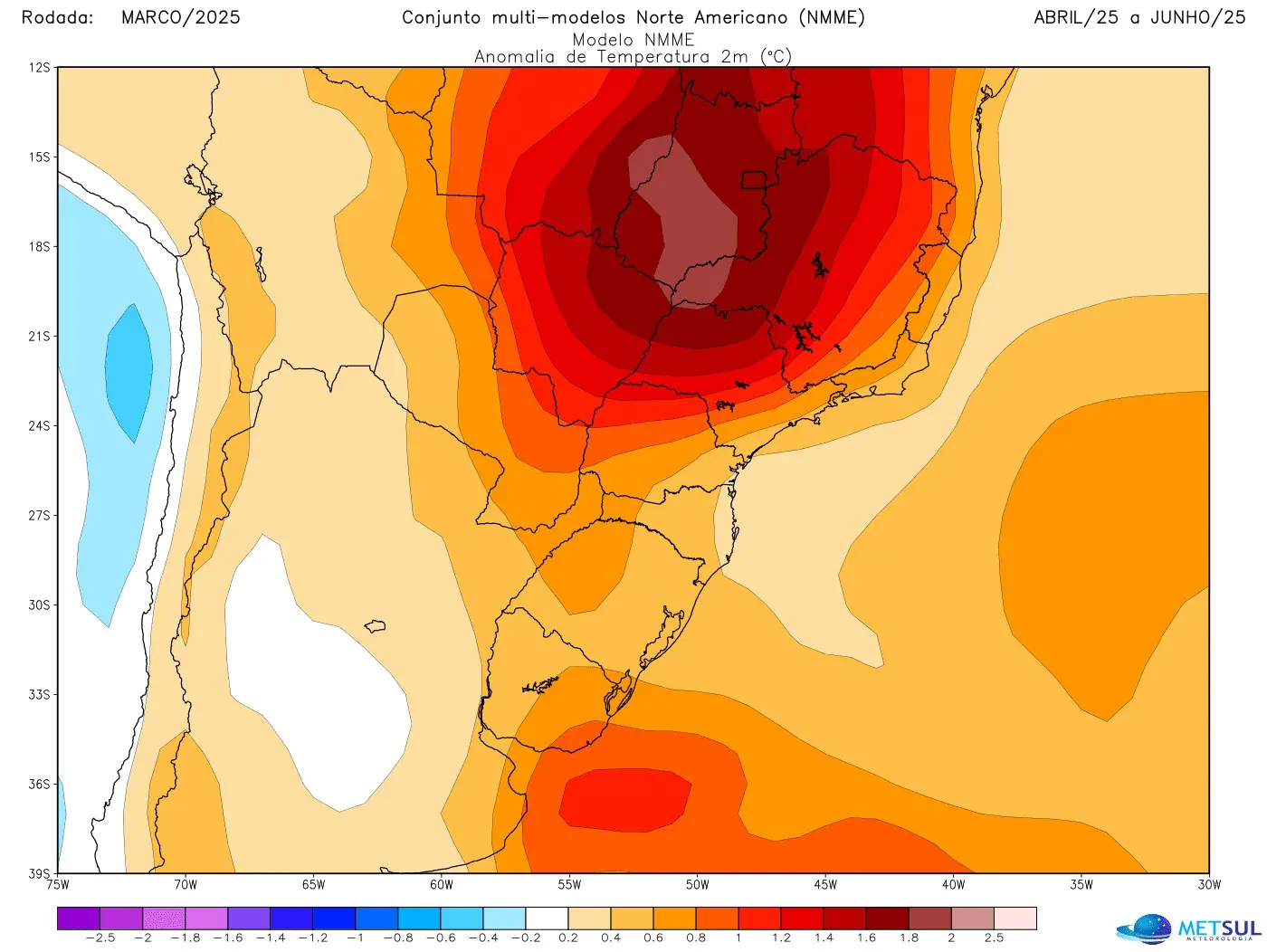 A partir de todos os dados de modelos e outros de analogia histórica e teleconexões climáticas, a MetSul espera um outono com predomínio de dias de temperatura acima da média na maioria dos estados do Centro-Sul do Brasil e vários com calor. A temperatura deve ficar muito acima da média em algumas áreas, principalmente em parte do Centro do país.