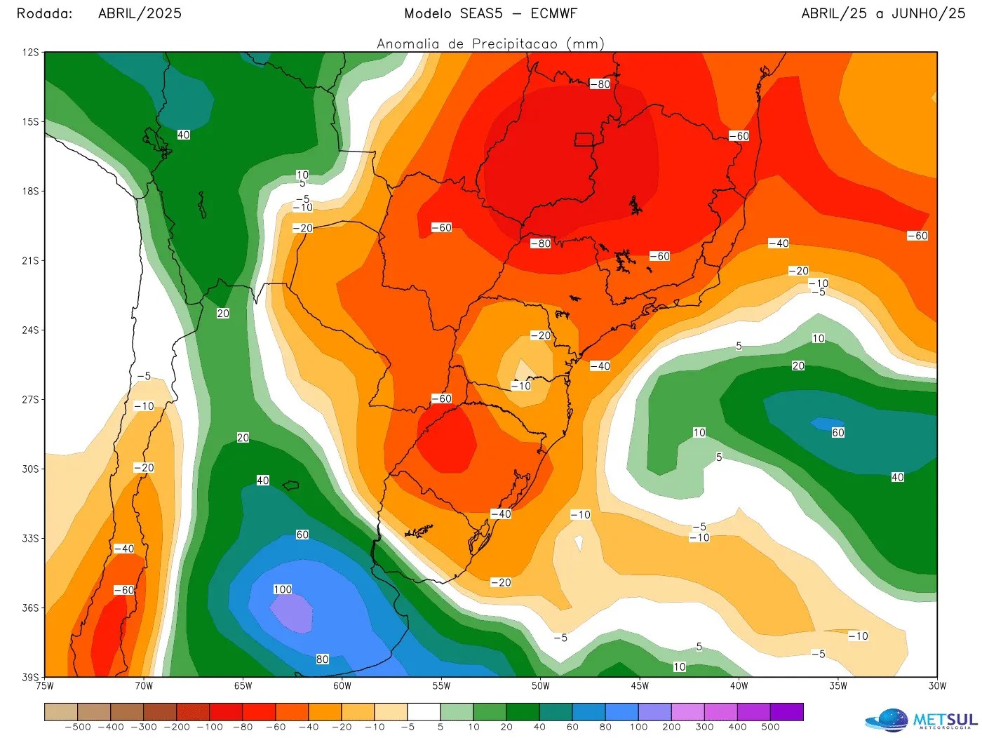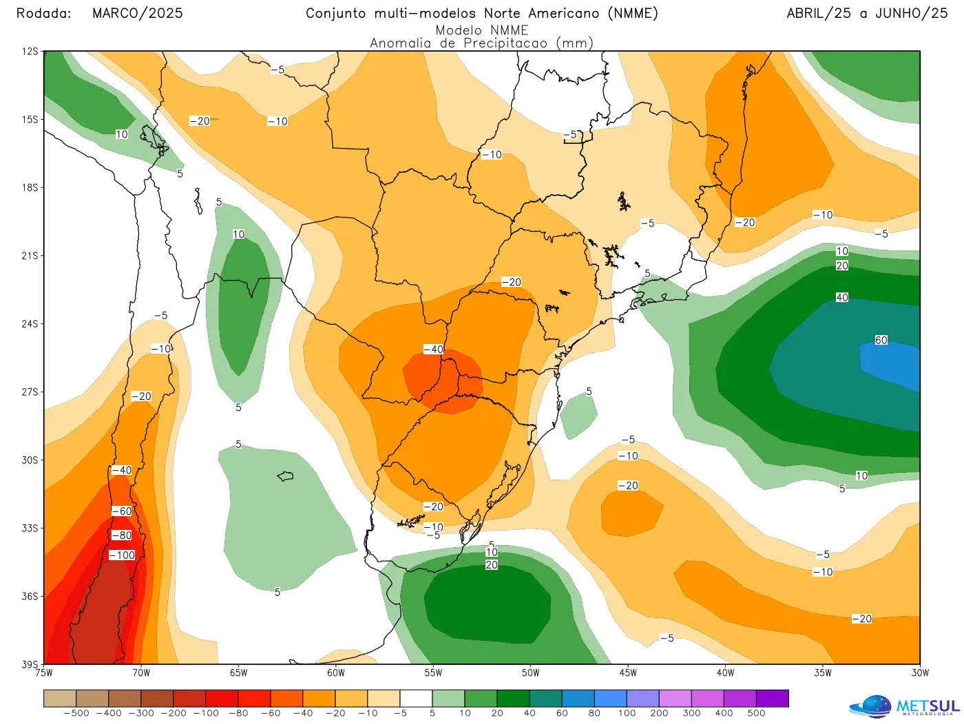 Os mapas abaixo mostram as projeções de anomalia (desvio da média) de chuva do trimestre de abril a junho do modelo SEAS5 do Centro Meteorológico Europeu (ECMWF) e do NMME, que reúne modelos norte-americanos e canadenses. Os mapas não necessariamente representam a previsão da MetSul Meteorologia.
