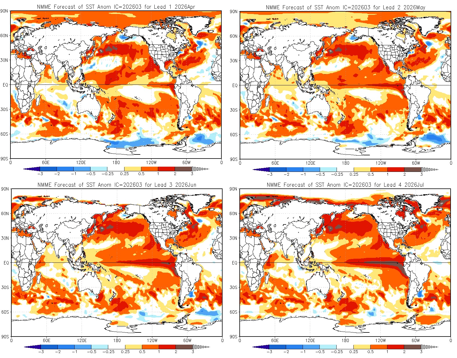 Os mapas abaixo mostram a projeção de anomalia de temperatura da superfície do mar para os meses de abril, maio, junho e julho, conforme os dados do modelo NMME (North American Multi-Model Ensemble) da NOAA.