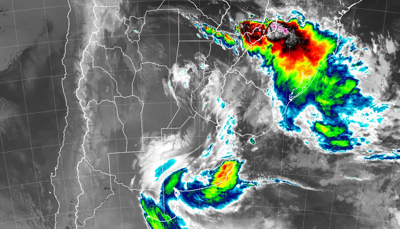 Imagem de satélite do final da madrugada de hoje mostra intensa instabilidade sobre parte do Sul do Brasil que traz muita chuva e raios enquanto mais ao Sul um ciclone extratropical está em formação na Argentina | NOAA