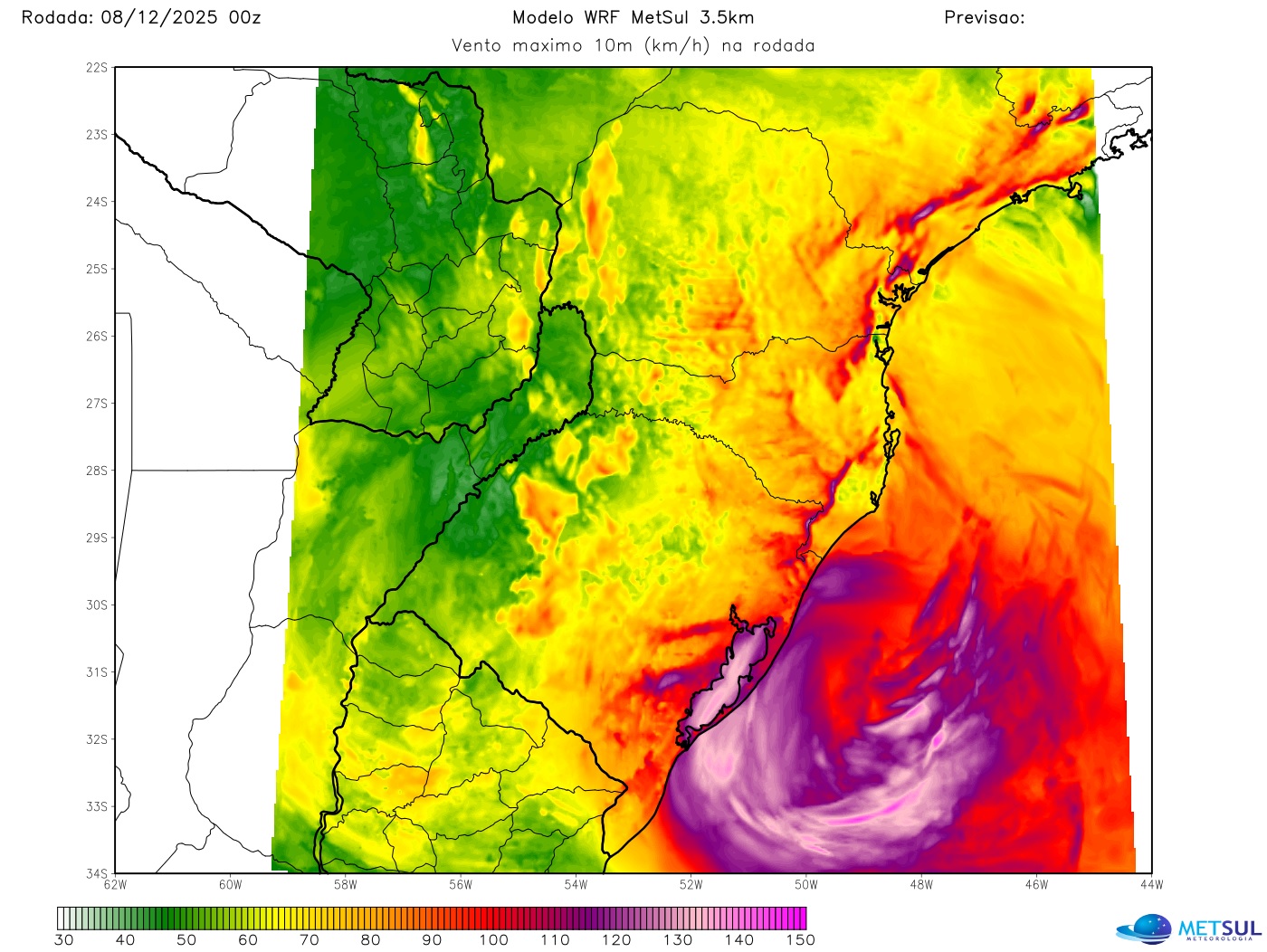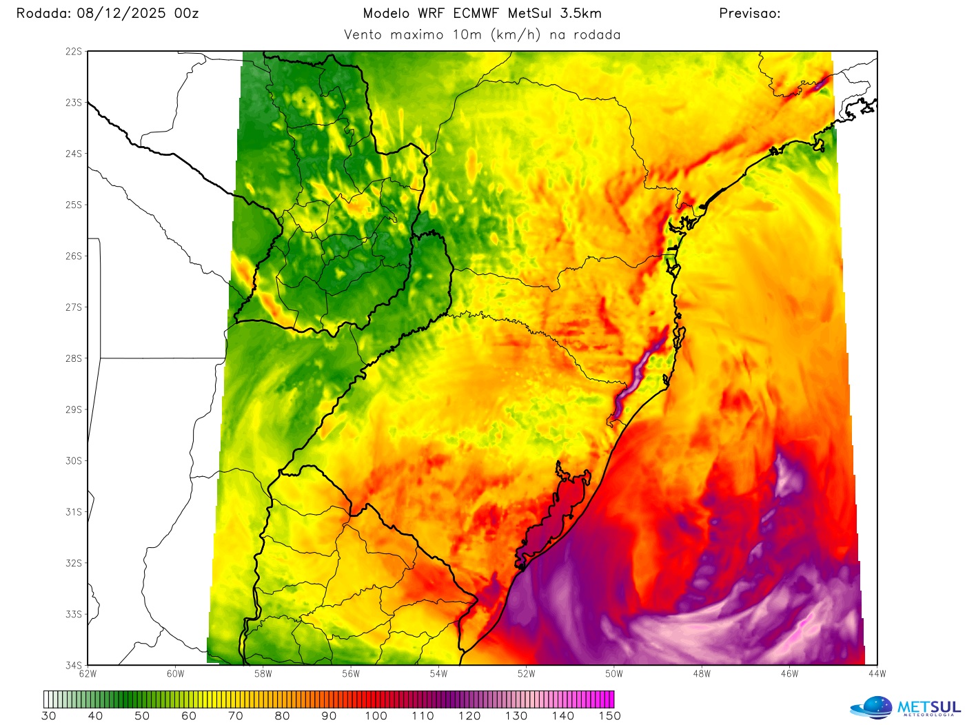 A nossa previsão indica rajadas de 80 a km/h 100 km/h no Sul e no Leste do Rio Grande do Sul, especialmente durante a quarta-feira, mas com possibilidade de rajadas de 100 km/h a 120 km/h e isoladamente superiores no Sul, litoral gaúcho e área da Lagoa dos Patos e seu entorno nas duas margens.