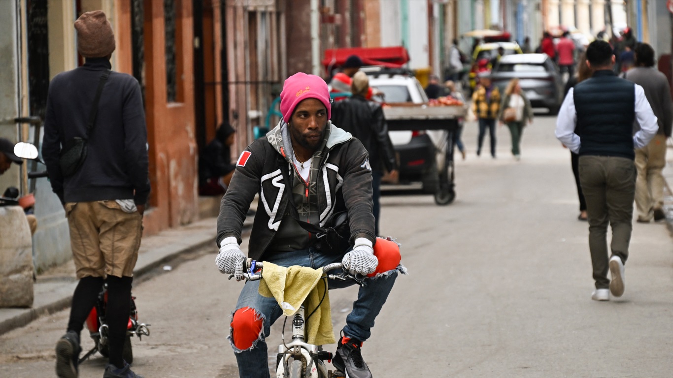 Um cubano agasalhado anda de bicicleta por uma rua de Havana nesta terça após amanhecer com 4ºC. Cuba registrou um recorde de temperatura mínima nacional de 0ºC na primeira vez que o ponto de congelamento foi documentado na ilha caribenha, segundo o Instituto de Meteorologia do país.| YAMIL LAGE/AFP/METSUL
