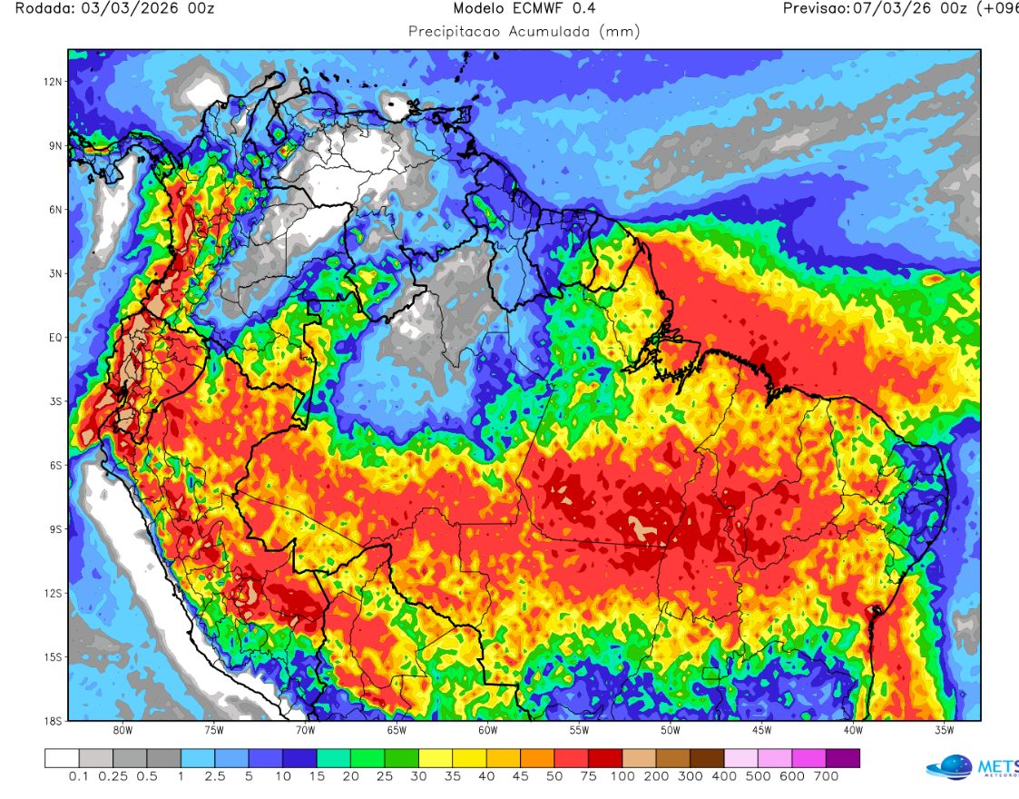 Por último o mapa acima com a projeção do acumulado de chuva para as próximas 96 horas indica volumes ao redor de 100 mm desde o sul do Amazonas até o interior de Pernambuco, Ceará e Bahia. Ao passa que pontualmente projeta volumes entre 100 e 200 mm, sobretudo, na Metade Sul do Pará e no Matopiba.